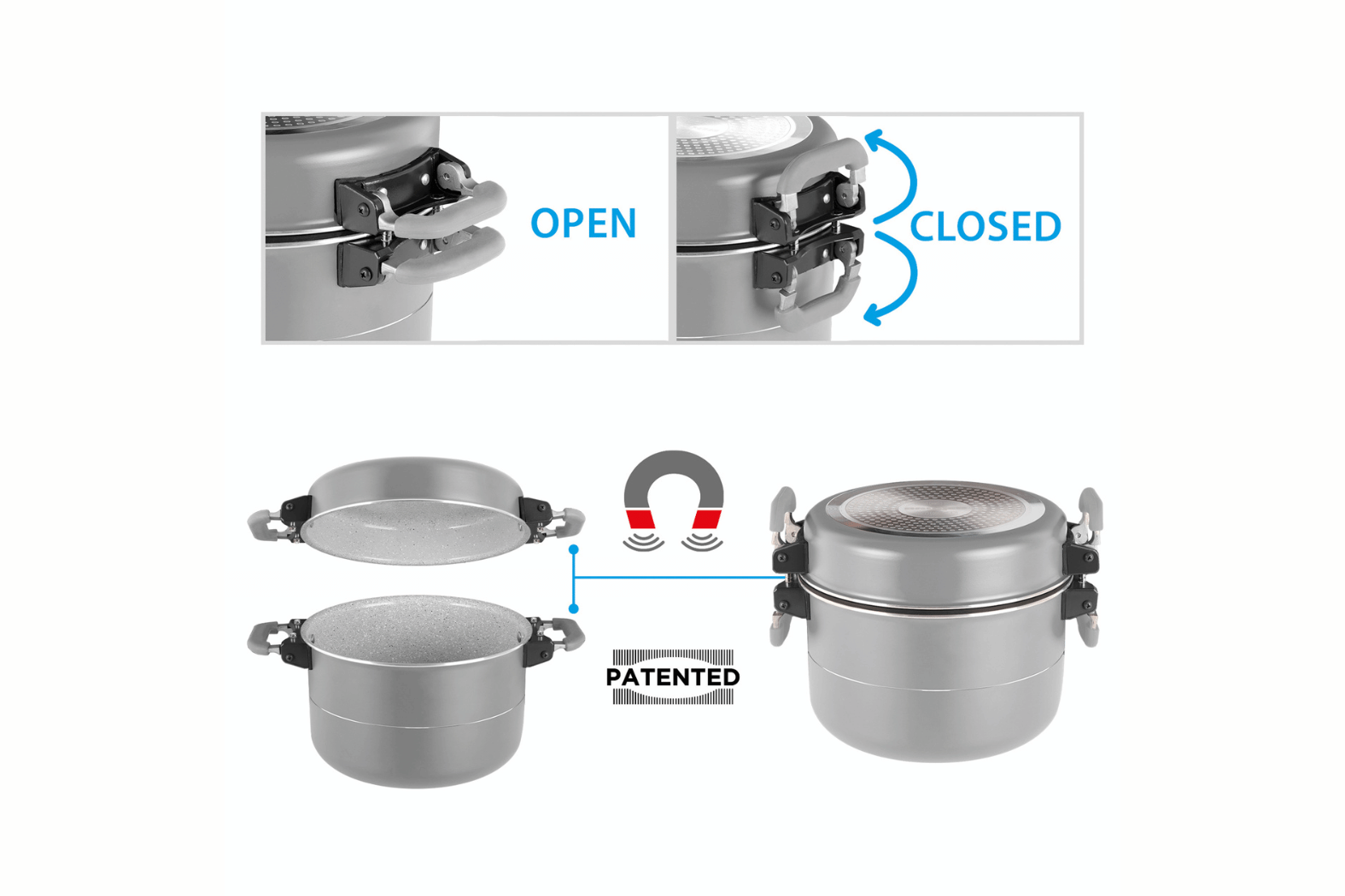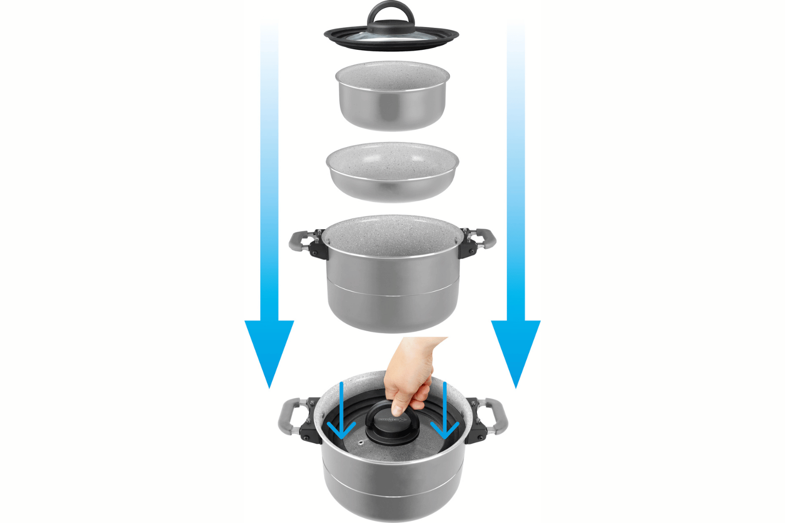 The Fusion set uses lightweight aluminium with a scratch-resistant ceramic non-stick coating, giving even heat distribution and simple cleaning. Its patented handle and connection system — fold-down handles with integrated magnetic elements (Magnetogrip) — significantly reduces the packed size of the cookware. Additionally, the built-in stacking and locking mechanism (Vacublock) ensures all pots and pans stay securely nested, eliminating rattling or movement during transport and protecting the non-stick surfaces from scratches.