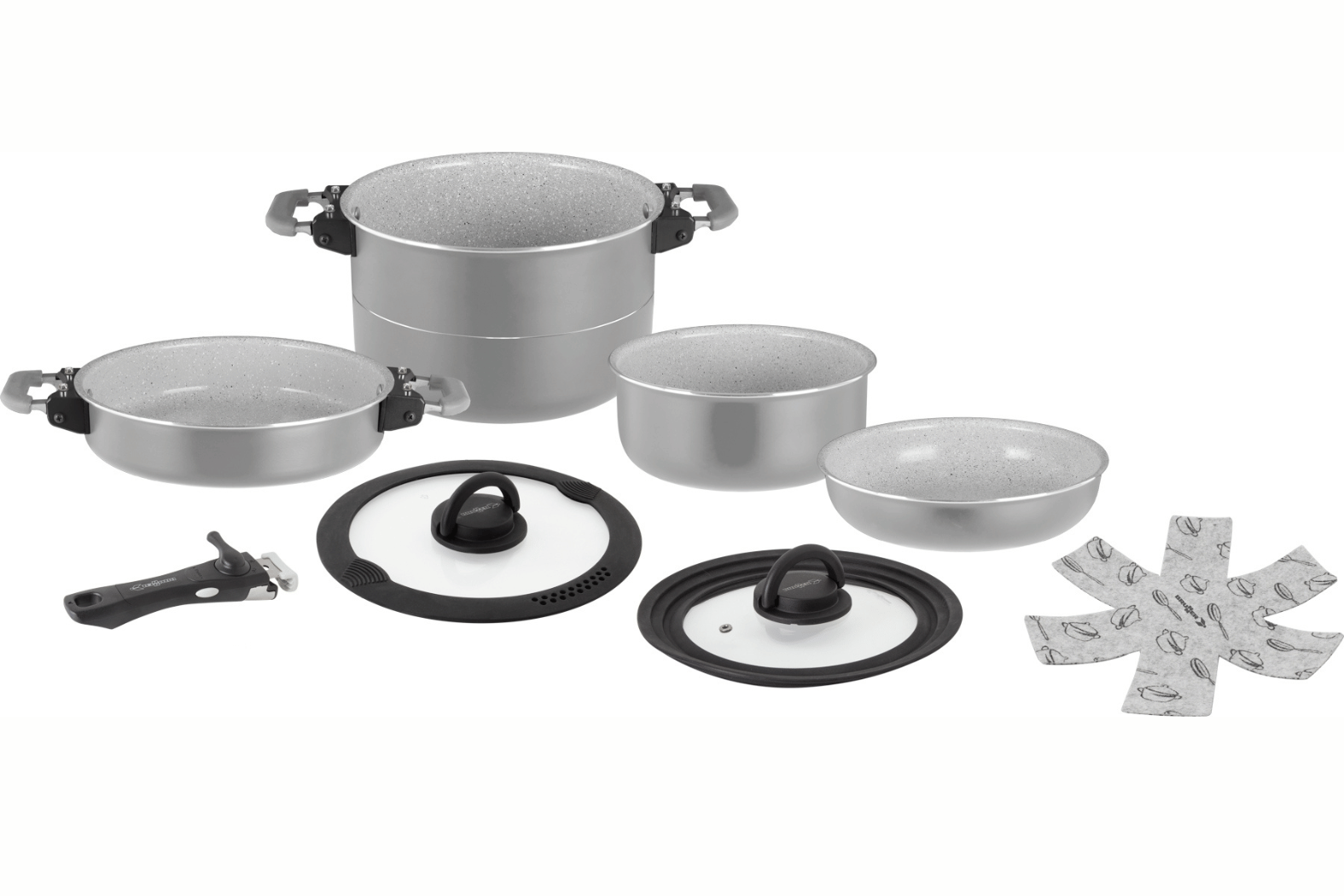 - Complete set: large and small pots, two pans, two lids, removable handle — ready for a full range of cooking tasks