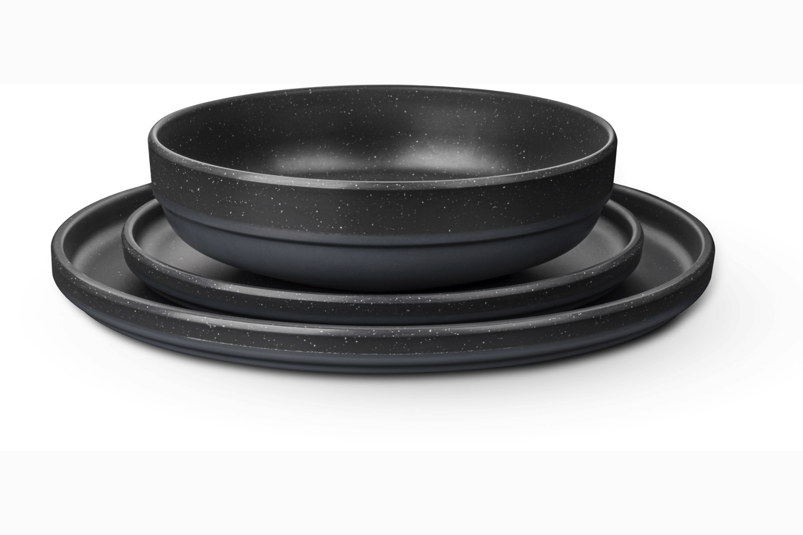 The Midday Odette Double Black set is crafted from a high-quality melamine/mineral composite under the StoneTouch™ label. Furthermore, the material resists heat, moisture, and impact while maintaining a surface hardness comparable to porcelain. In addition, each piece includes a rubber anti-slip ring which enhances stability and minimizes rattling during travel. The set includes four dinner plates (Ø 25 cm), four dessert plates (Ø 19 cm) and four bowls (Ø 17 cm) according to the manufacturer specification.