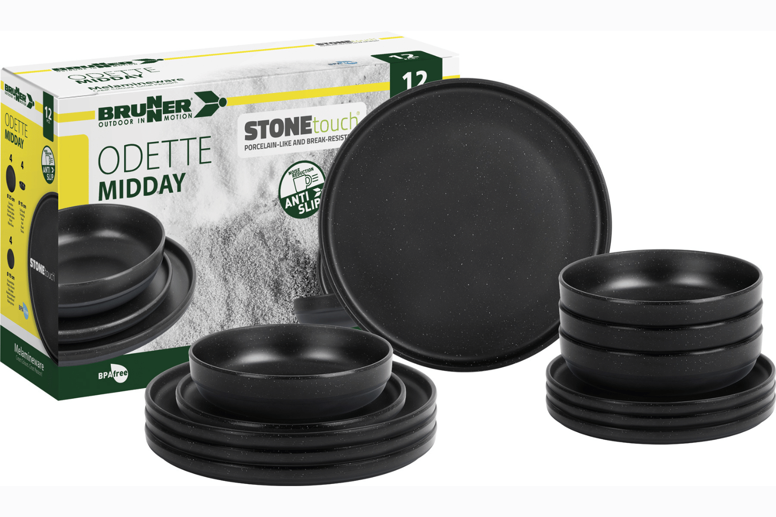 Upgrade your outdoor dining setup with the Brunner Midday Odette Double Black 12-Piece Melamineware Set — designed for style, durability and ease on the move. Whether you’re dining under your awning, relaxing in your caravan or entertaining on the patio, this set combines aesthetic appeal with rugged functionality. Moreover, thanks to its StoneTouch™ melamine/mineral blend, you get a porcelain-look finish without the fragility of ceramic. In addition, the anti-slip base rings keep each piece steady on uneven ground or in mobile setups.