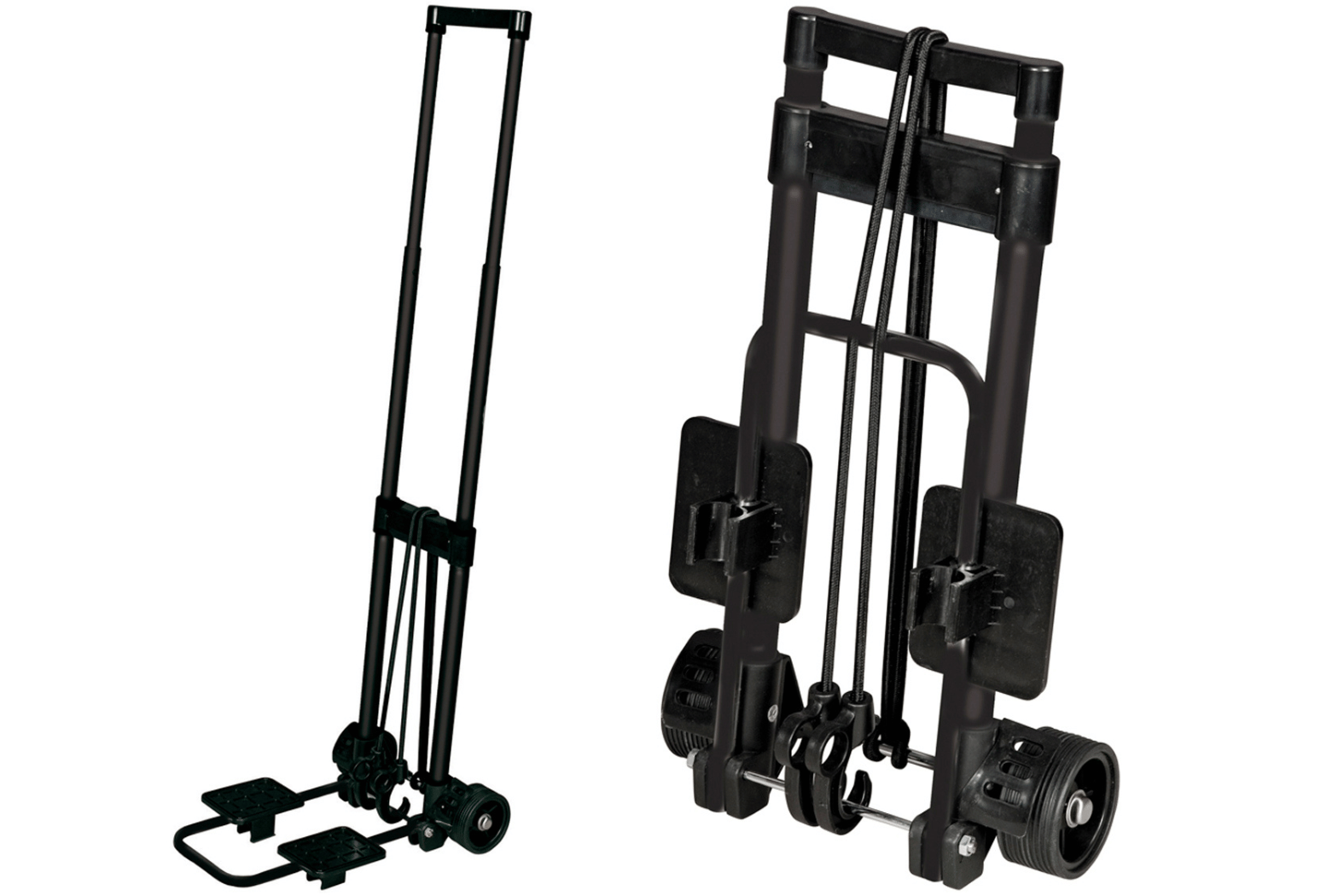 Constructed with a telescopic folding frame and robust plastic joints, the Mini Rolly delivers dependable strength while remaining lightweight at approximately 1.35 kg. The wide wheels improve balance and manoeuvrability, which helps prevent tipping when loaded. Furthermore, the design supports a generous load capacity of around 30–35 kg, making it suitable for luggage, camping tools and other gear. In addition, the broad wheels roll smoothly, even when the trolley is heavily loaded.