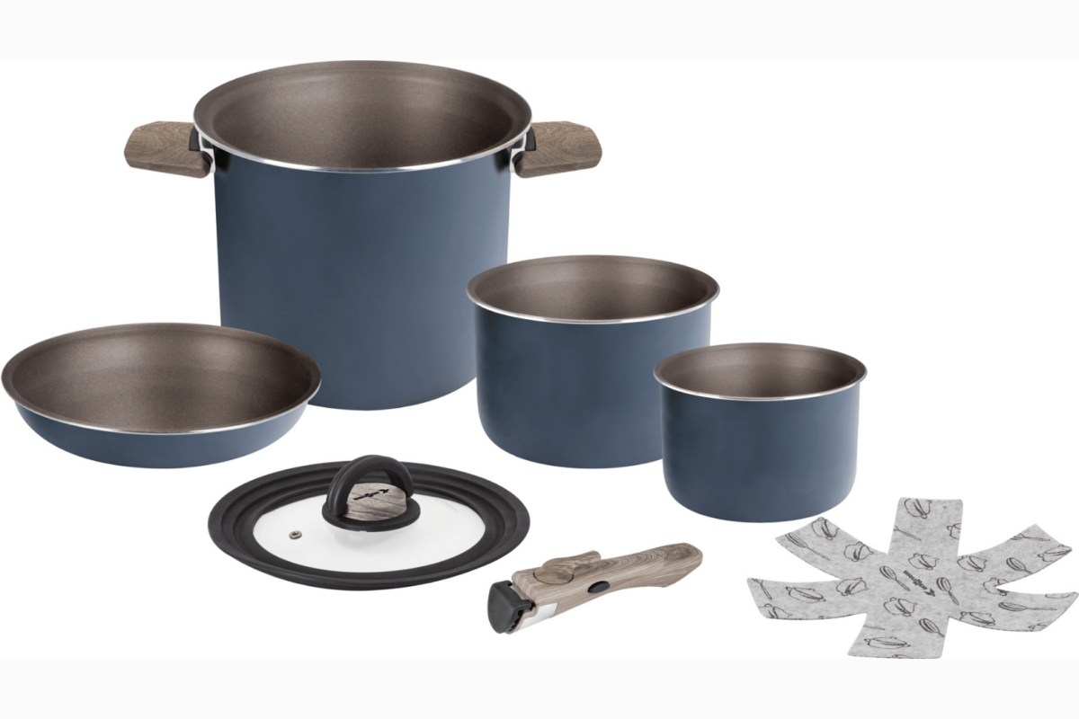 The Torralta set is made from recycled aluminium and finished with a non-stick coating, giving you fast, even heat distribution and easy cleaning. Furthermore, each pot and pan features a specially designed edge that allows the whole set to stack securely without slipping — a major benefit for kitchens that experience movement or vibration, such as boats or motorhomes. In addition, the outer pot and pan include foldable handles that reduce bulk when stored. Because the cookware works on all hob types — gas, electric, ceramic, radiant-ring and induction — you gain maximum flexibility, regardless of where you’re cooking.