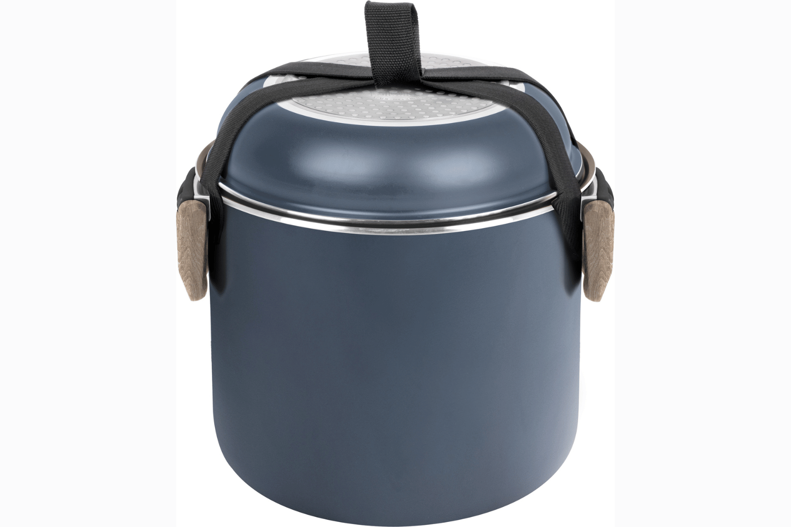 At just 2.25 kg for the complete set, Torralta is light enough for everyday handling and transport. The kit includes a large pot, two smaller saucepans, a shallow pan and a universal lid that fits multiple pieces, giving you everything you need to cook for two to four people. Moreover, this range of sizes lets you boil, fry, sauté or simmer using one compact system. When nested together, the entire set takes up very little space — a real advantage for van kitchens, boats or compact living areas where every centimetre counts.