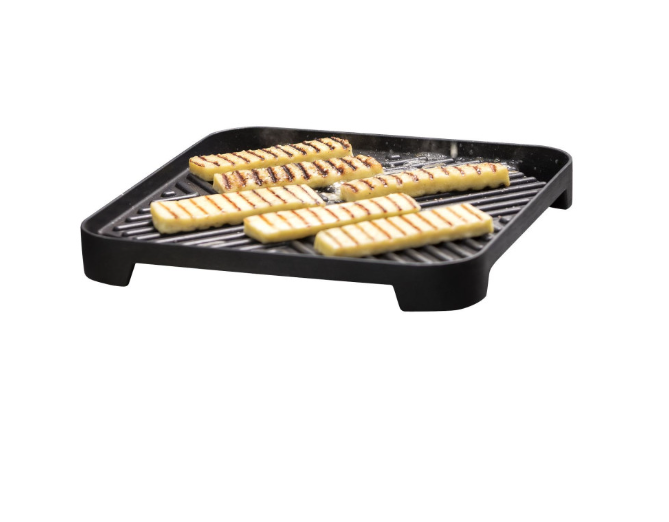 The ceramic-coated ribbed grill plate is ideal for grilling chicken wings, burgers and creating griddled veg.
