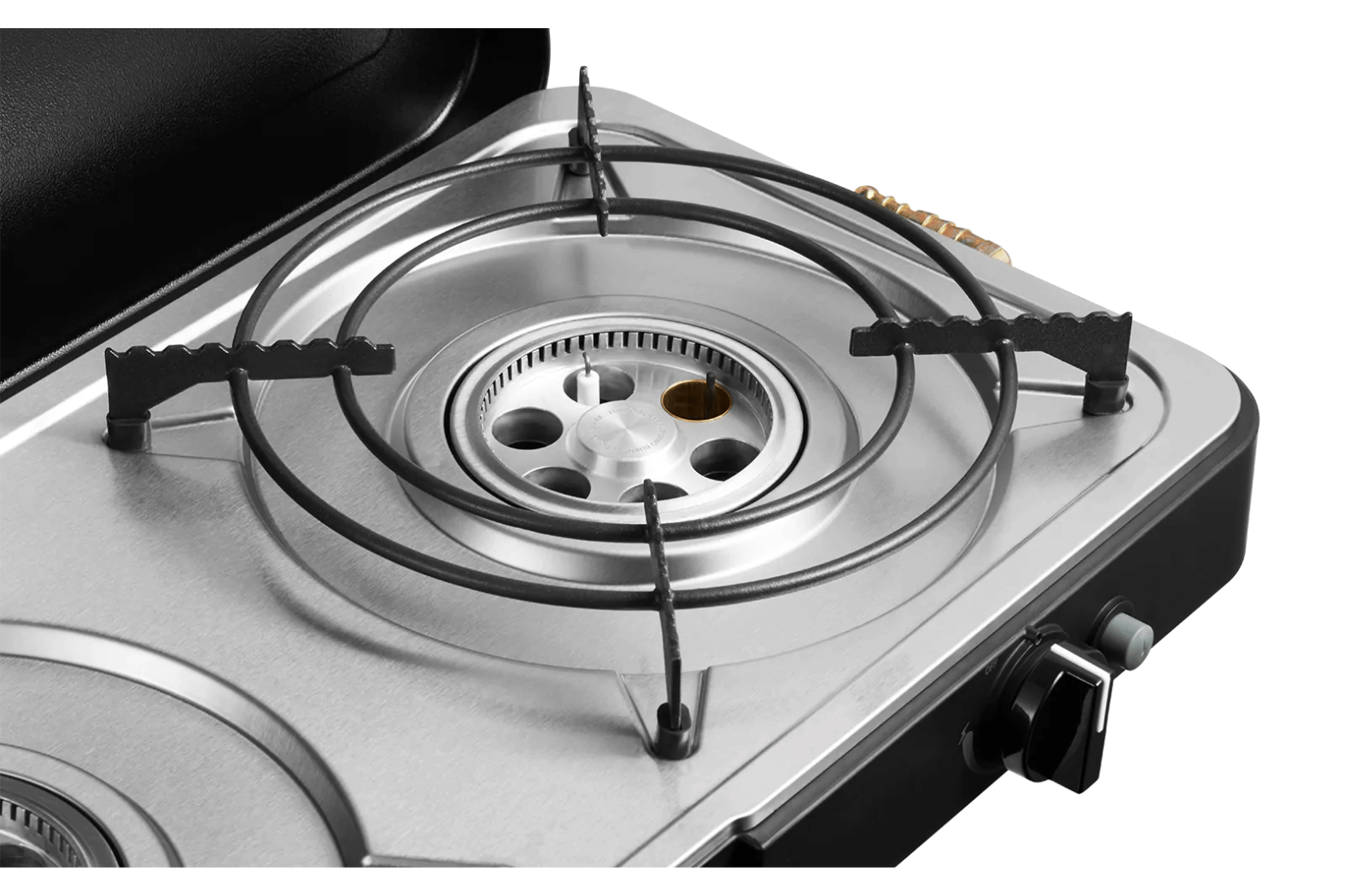 This model features two independent Turbo burners, each with a built-in Flame Failure Device (FFD). The FFD automatically shuts off the gas supply if the flame goes out unexpectedly, enhancing safety during use. The recessed burner design improves wind resistance, making it especially suitable for outdoor cooking conditions. Both burners use push-button piezo ignition for quick, match-free lighting.