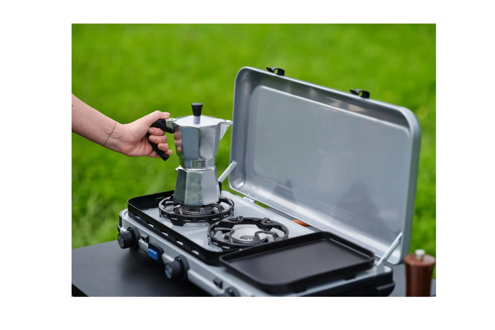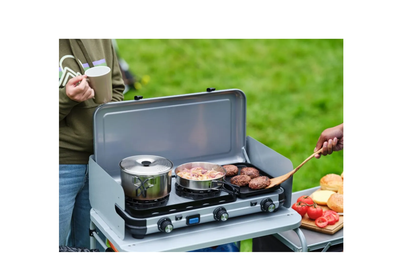 Whether you’re prepping breakfast under a canopy or cooking dinner on a campsite table, the Campingaz Camping Kitchen 2 Multi-Cook Gas Stove offers flexibility, power and convenience. Moreover, its high output and smart layout make it a standout for outdoor cooks. In addition, its compact footprint fits tighter spaces yet still gives full meal-prep capabilities.