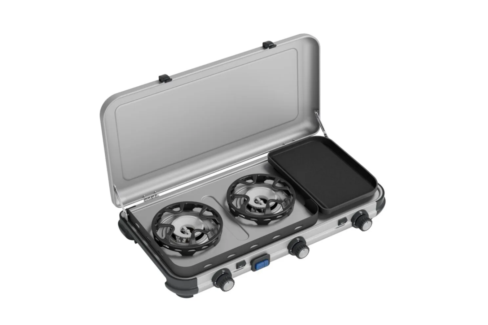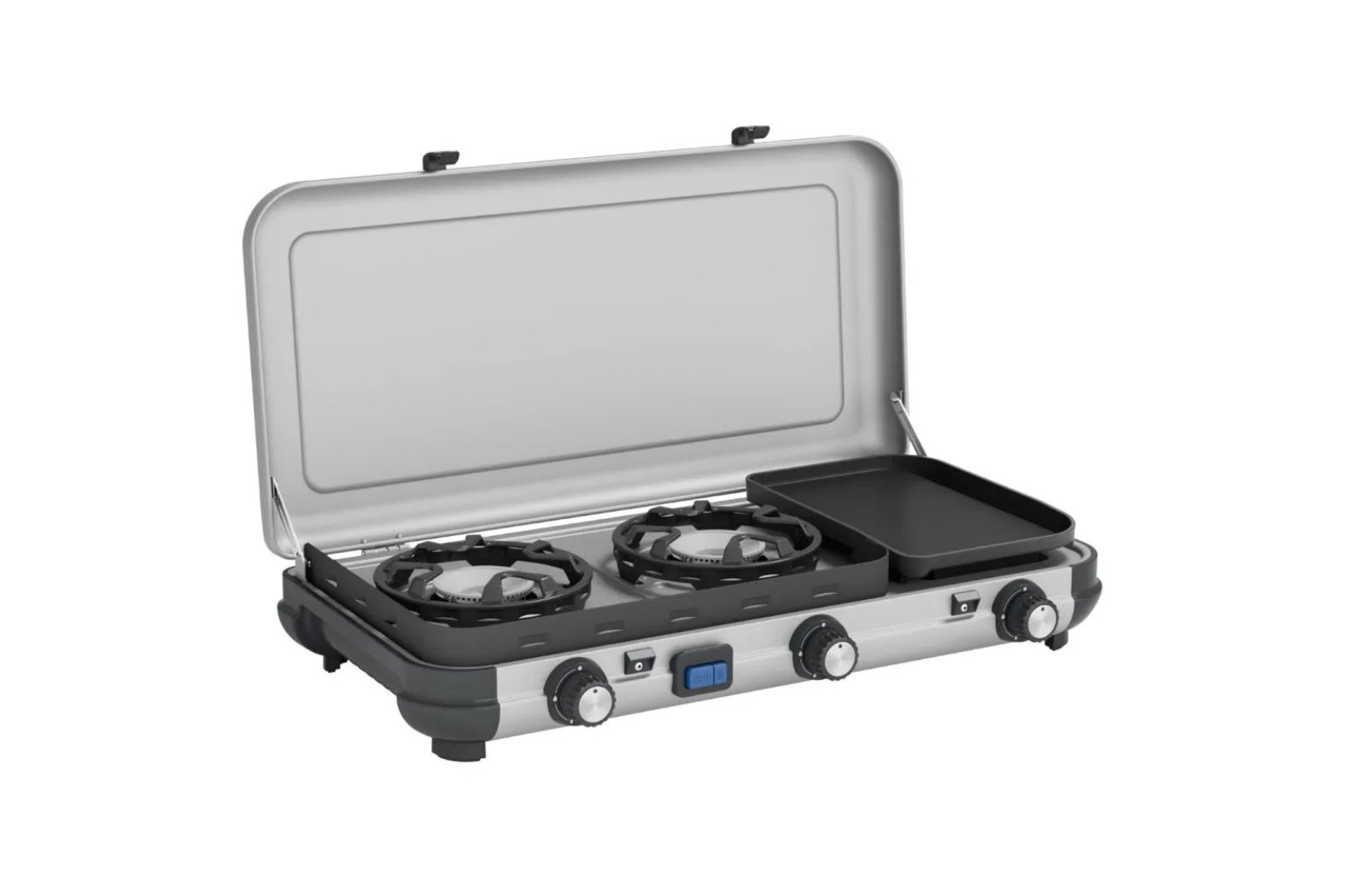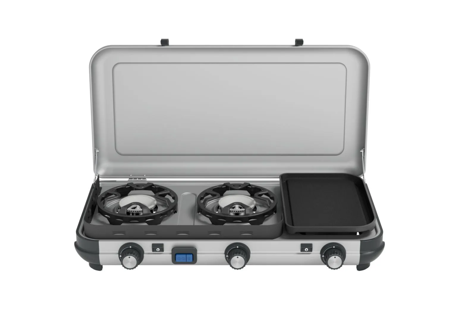 Built for durability and ease, the Campingaz Camping Kitchen 2Â incorporates a die-cast aluminium griddle with a PTFE non-stick coating for fast grilling or toasting. Moreover, all pan supports and griddle plates are removable and dishwasher safe for effortless cleanup. In addition, the dual piezo ignition gives safe, match-free start-up. Furthermore, this model supports R904 and R907 refillable butane cylinders with the appropriate hose and regulator (sold separately). Portable Design and Quick Setup for the Camping Kitchen 2 Multi-Cook