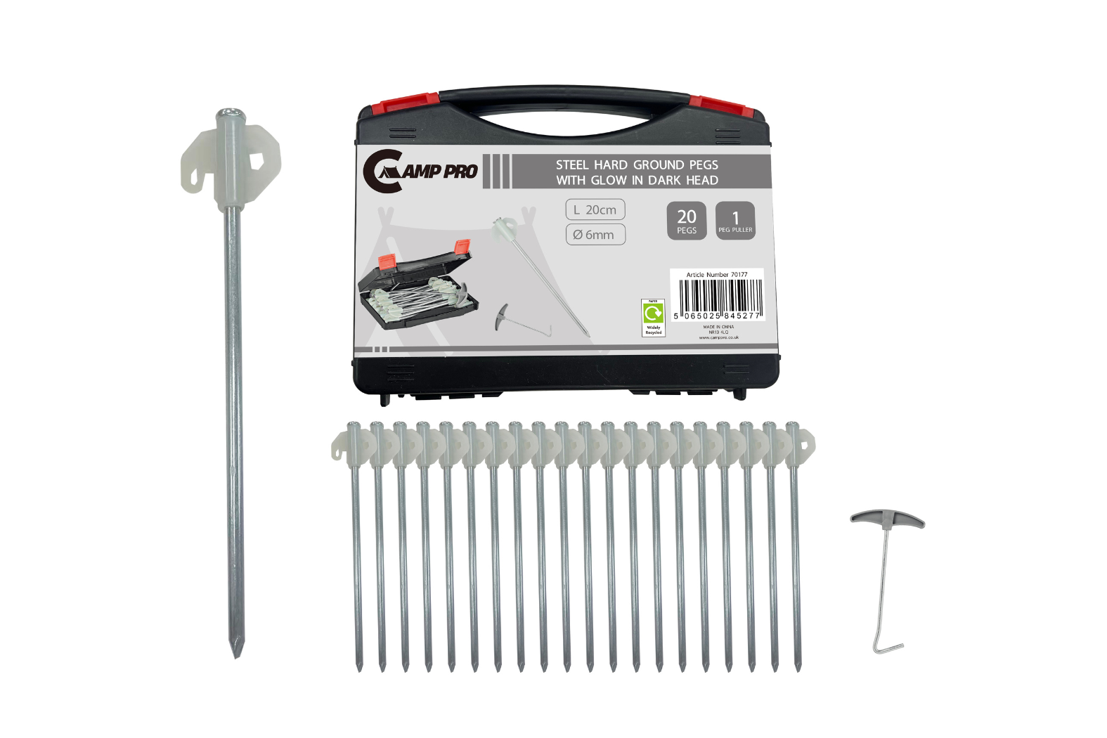 The Camp Pro Steel Hard Ground Pegs with Glow-in-the-Dark Head come supplied as a complete 20-piece set, ready for immediate use. Whether you are securing a family tent, stabilising an awning, or anchoring additional shelters, this set offers a practical and dependable solution. Designed to support confident pitching, it’s a reliable addition to your camping kit — ready for that next adventure.