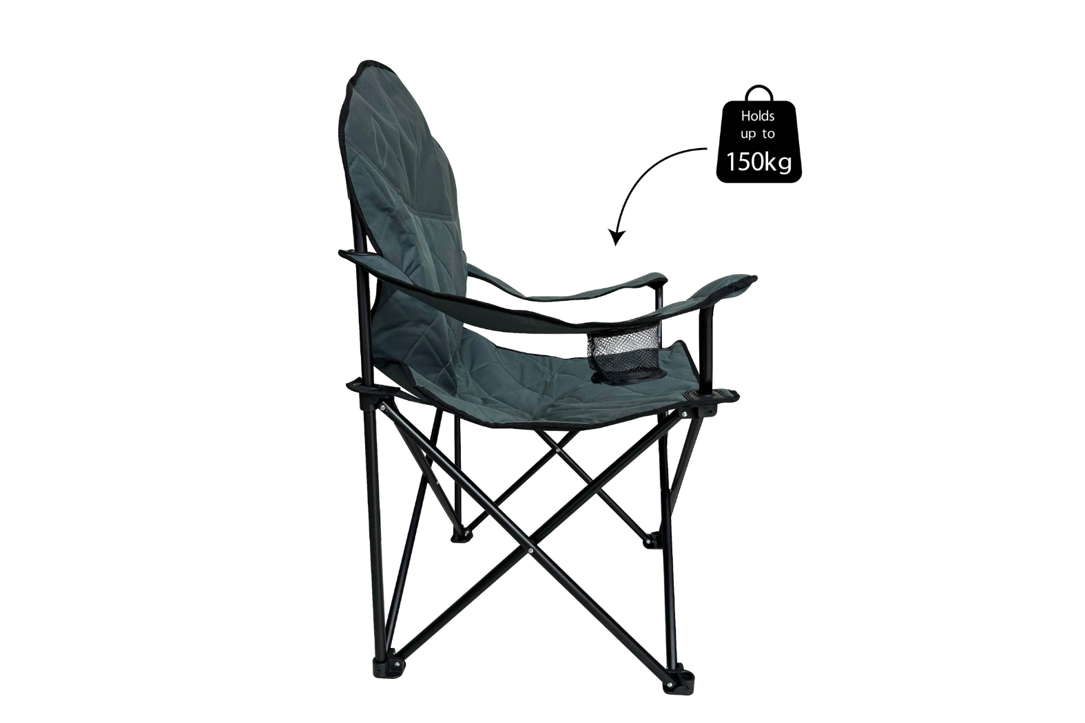 A built-in cup holder keeps drinks within easy reach, so you can relax without constantly getting up. The dark grey fabric with black edging gives the chair a clean, understated look that suits any outdoor setting. A subtle one-colour Camp Pro logo on the back completes the design without being intrusive. From quick weekend breaks to longer camping stays, this chair is designed to be comfortable, practical, and easy to enjoy.