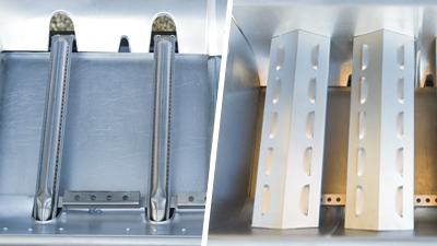 - Stainless Steel Tube Burners: Specially designed burners create V-shaped flames spread heat evenly across the cooking grid, while also preventing flare-ups