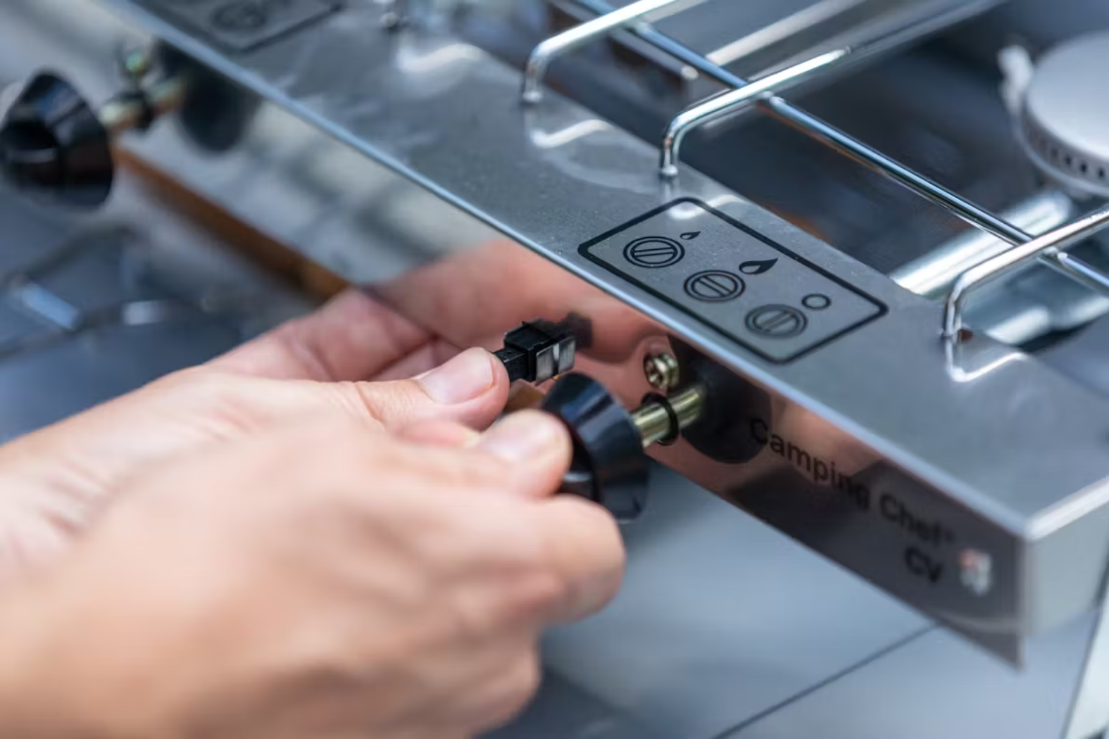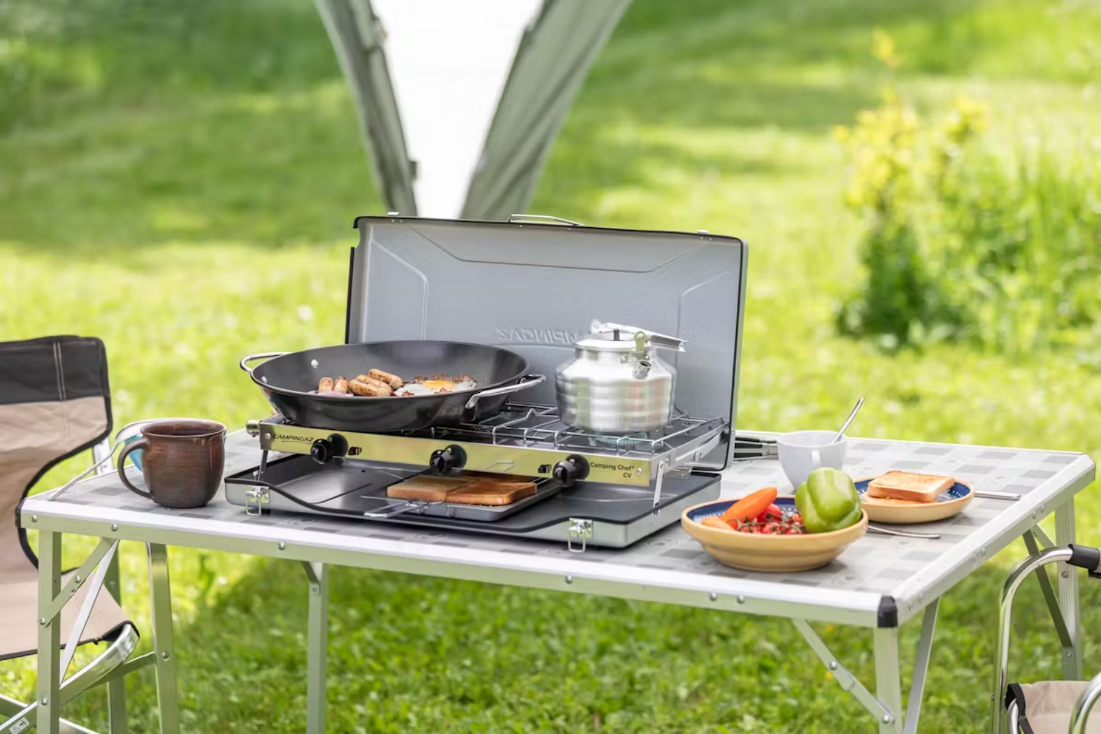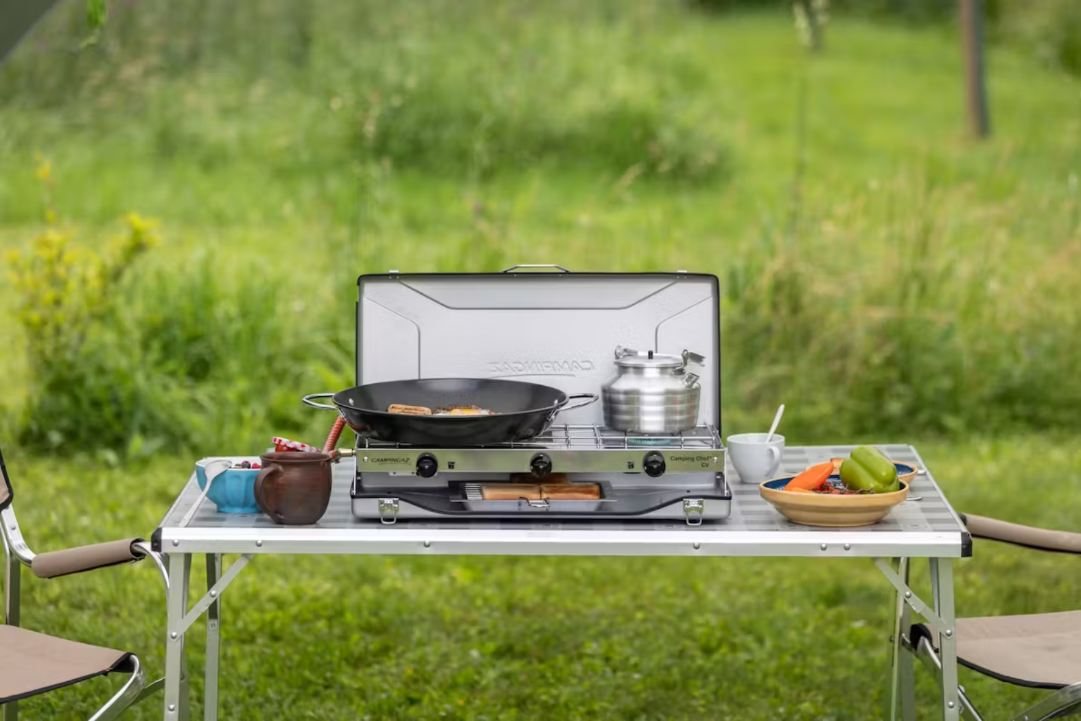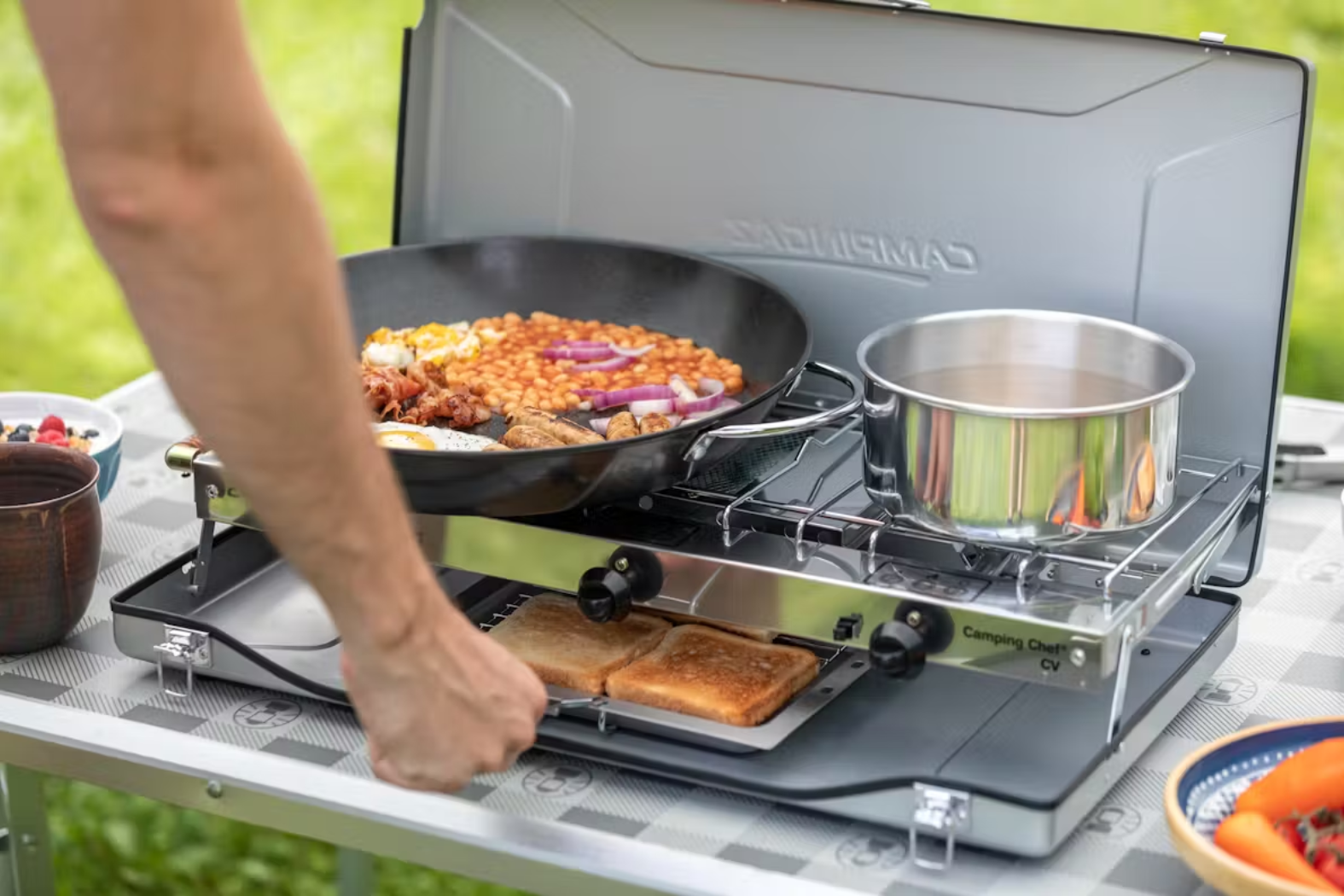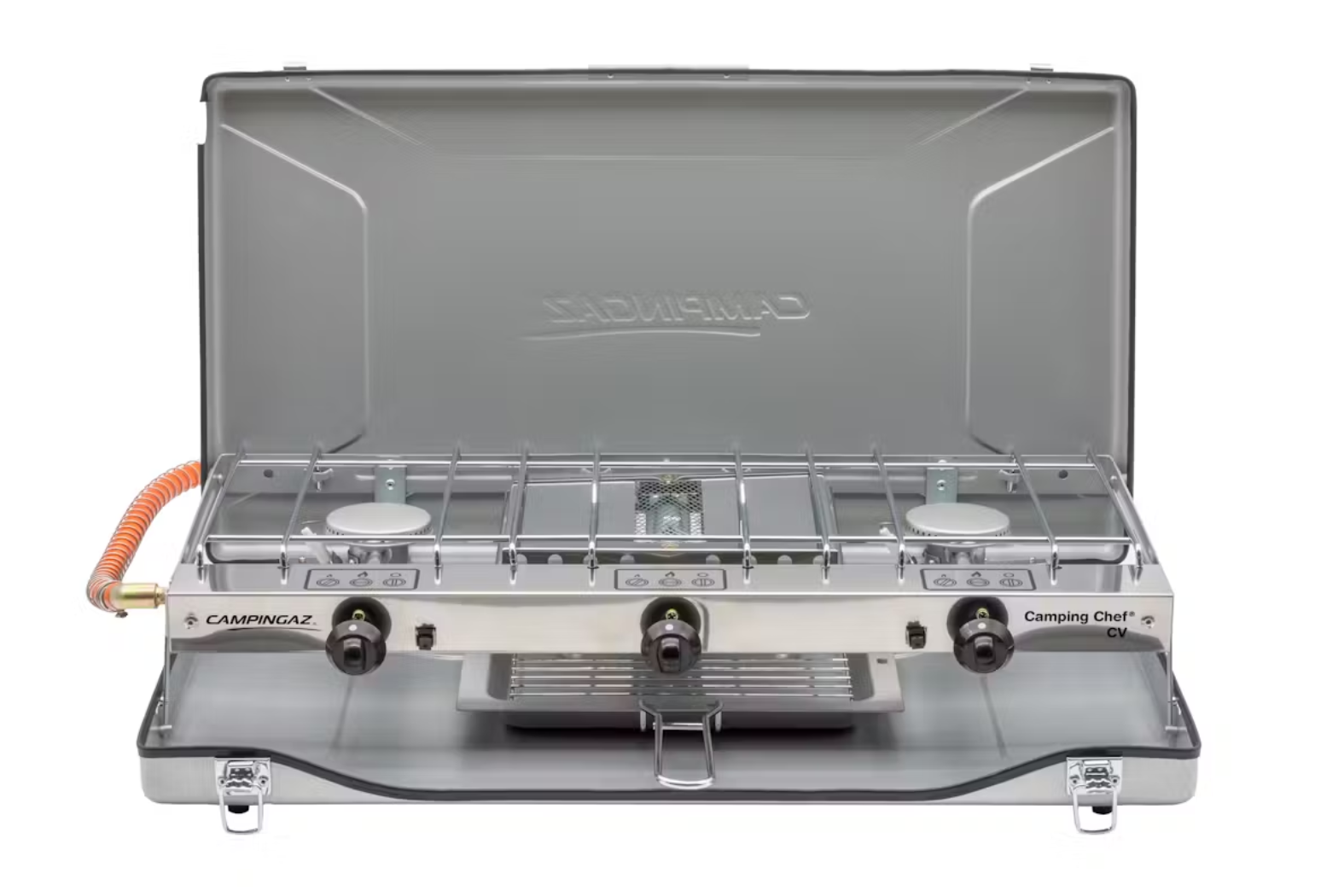 Dual-Burner + Grill Design: The Campingaz Camping Chef CV Gas Stove offers versatile cooking options.