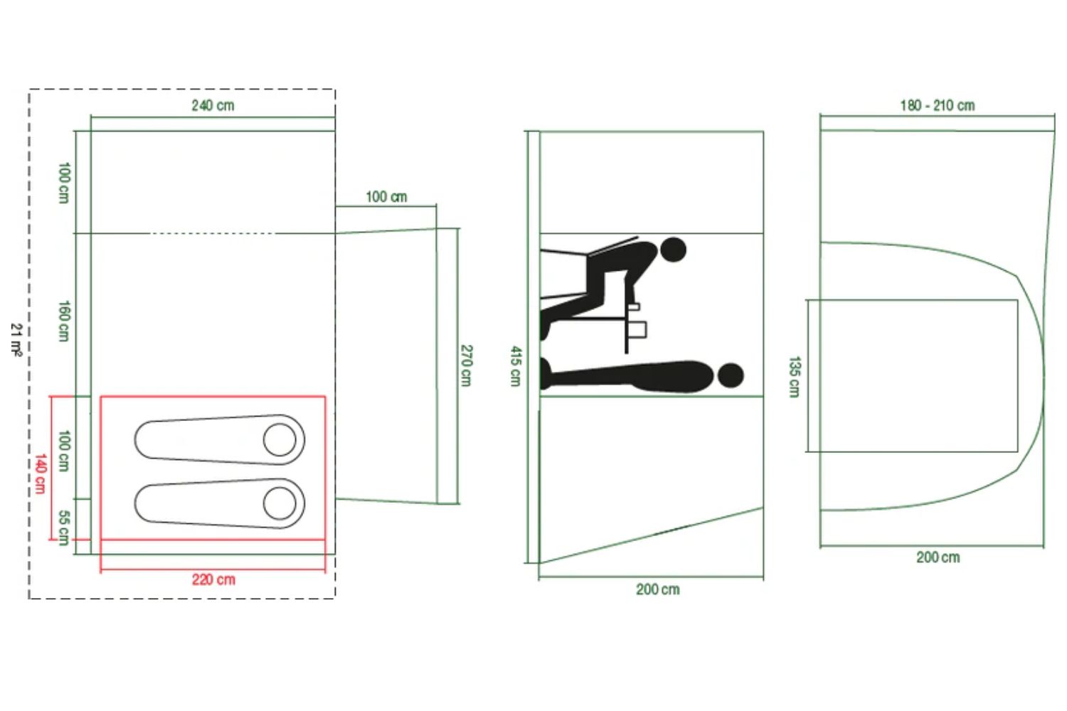 Dimensions (L x W x H): 515 x 240 x 200cm plus connecting tunnel: 100cm