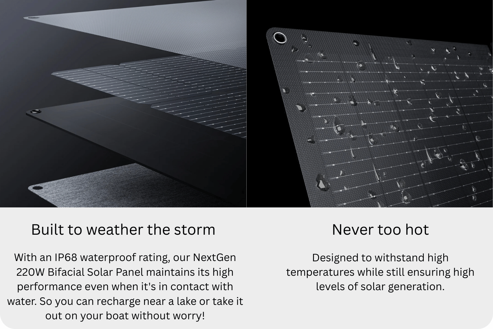 With a 220W primary side, and a 175W side on the back for ambient light, you can capture up to 28% more solar energy and charge your portable power station like the EcoFlow Delta 3 even faster. Making the Bifacial design perfect for capturing every bit of sunlight available, no matter the weather.