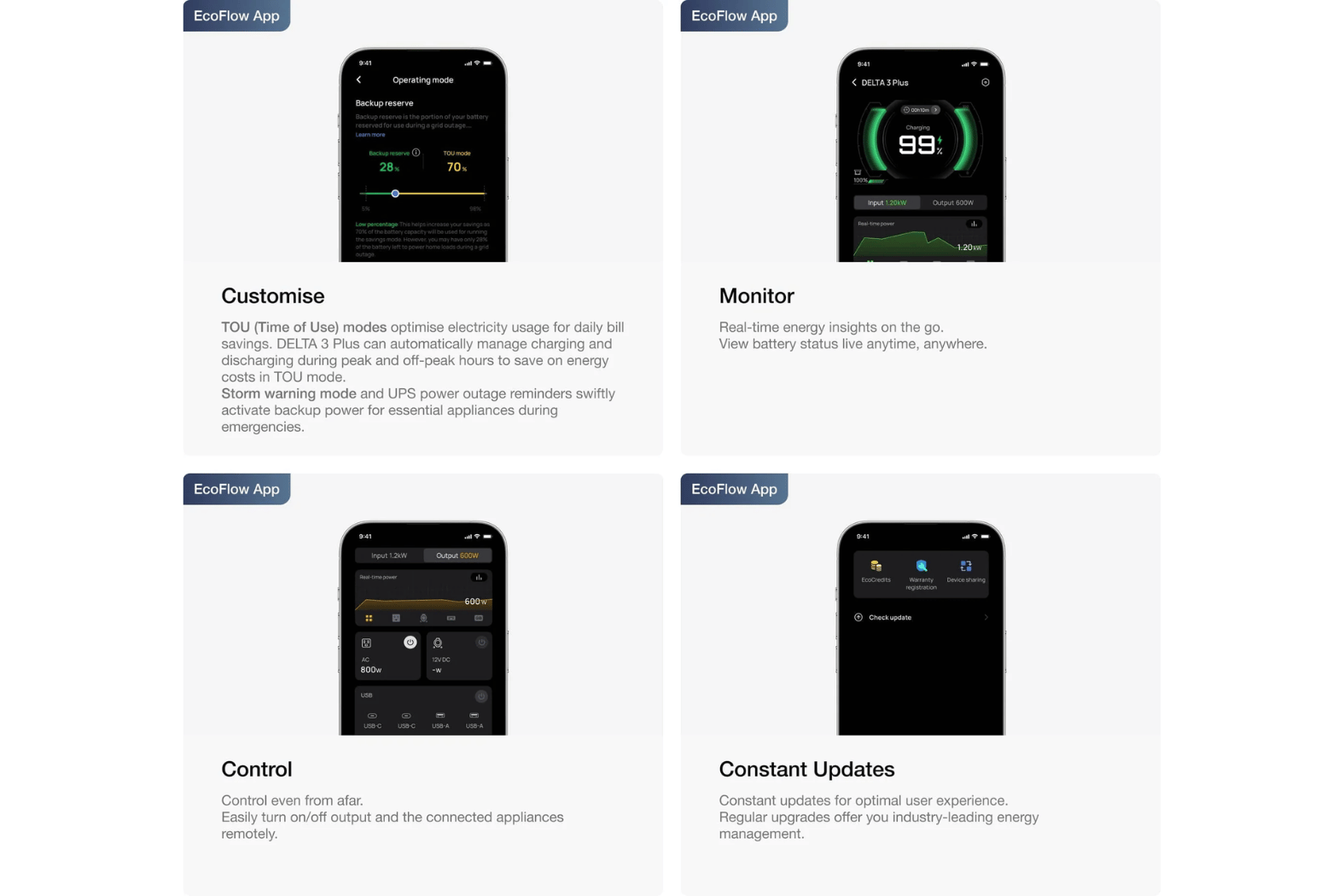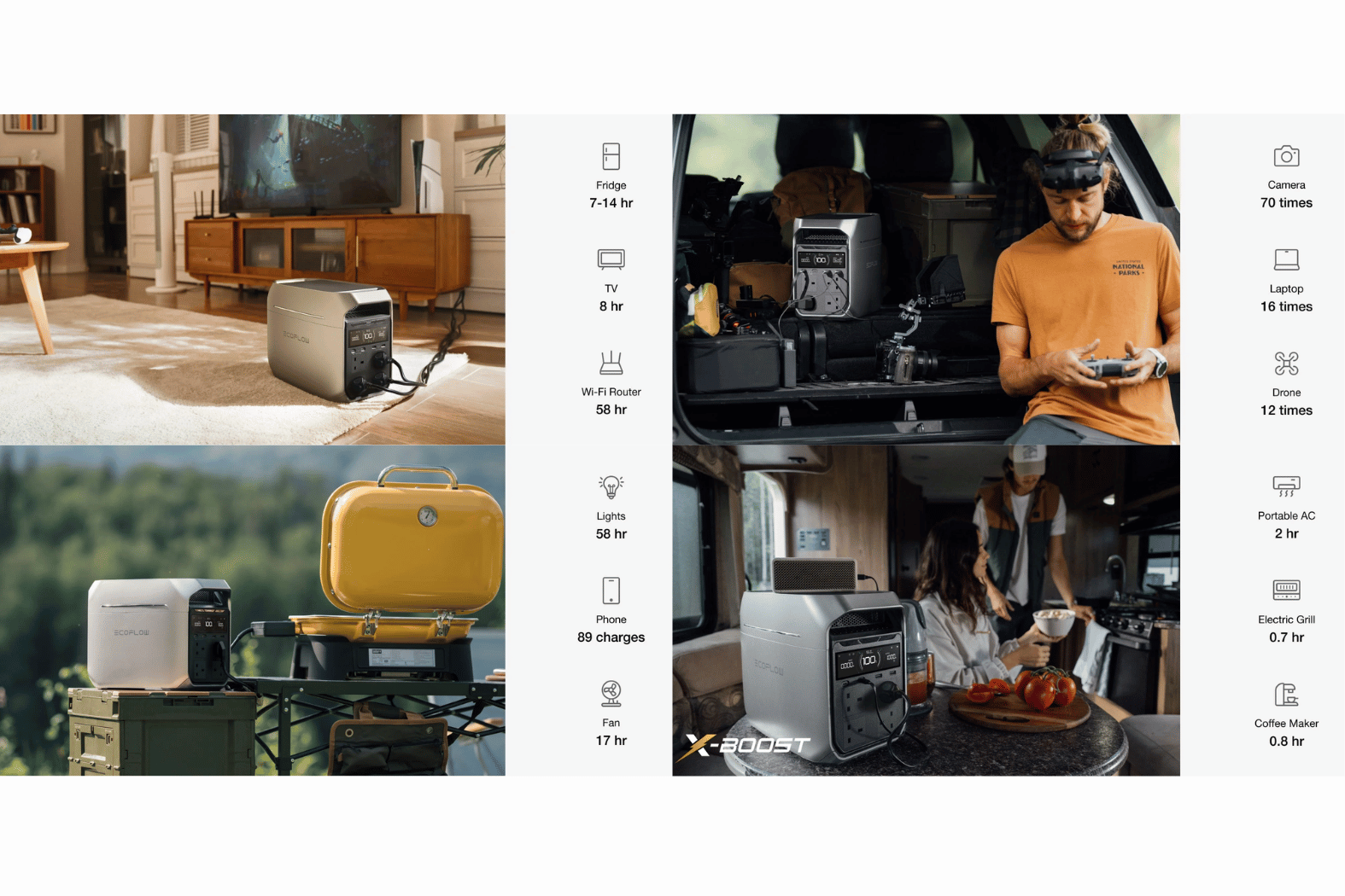 EcoFlow DELTA 3 Series supports 99% of household devices, including refrigerators, TVs, and computers. Plus, with X-Boost, continuously power appliances over 2400W, such as ovens (2150W), hair dryers (1800-2500W), and kettles (1200-3000W). Perfect for home usage, RV, and outdoor usage, this solar battery ensures you’re never left in the dark.