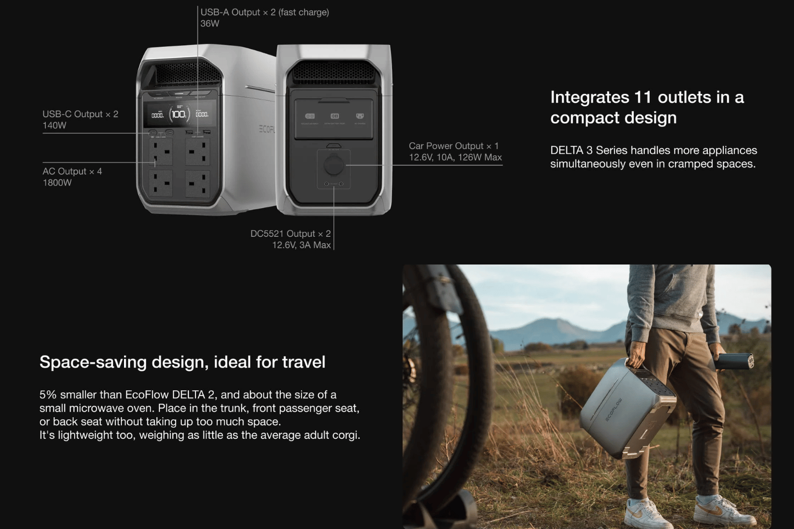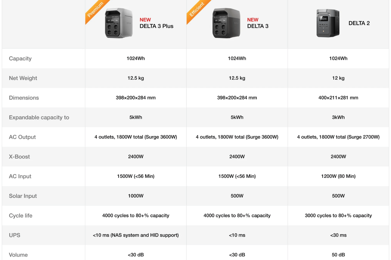 Solar: DELTA 3 – DC input 11V-60V1 Ă— 500W Max (130 Min) DELTA 3 Plus – DC input 11V-60V2 Ă— 500W Max (70 Min)