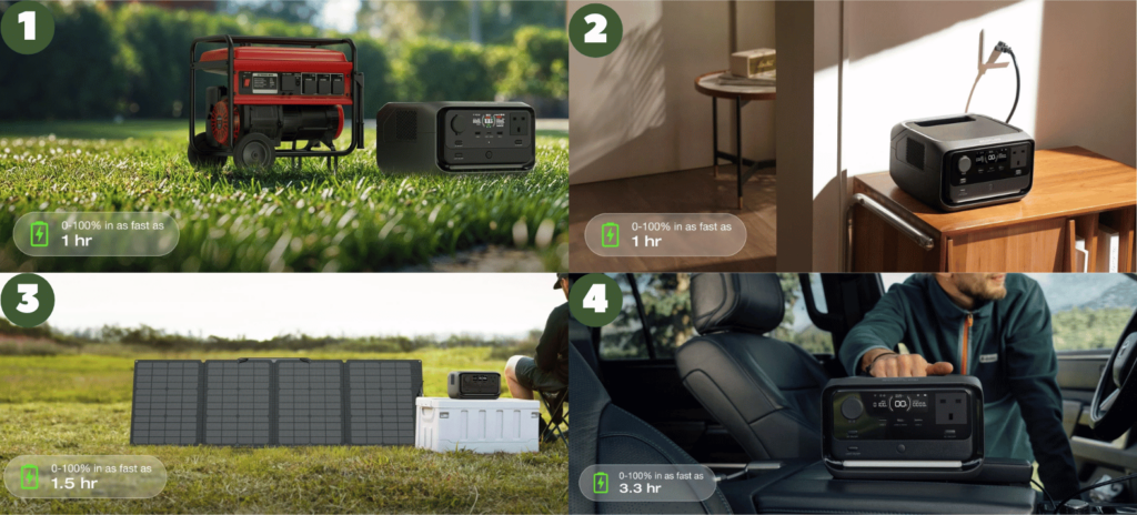 - Generator Charging: Recharge in just 1 hour with a gas generator for a full day of quiet, safe, and efficient power.