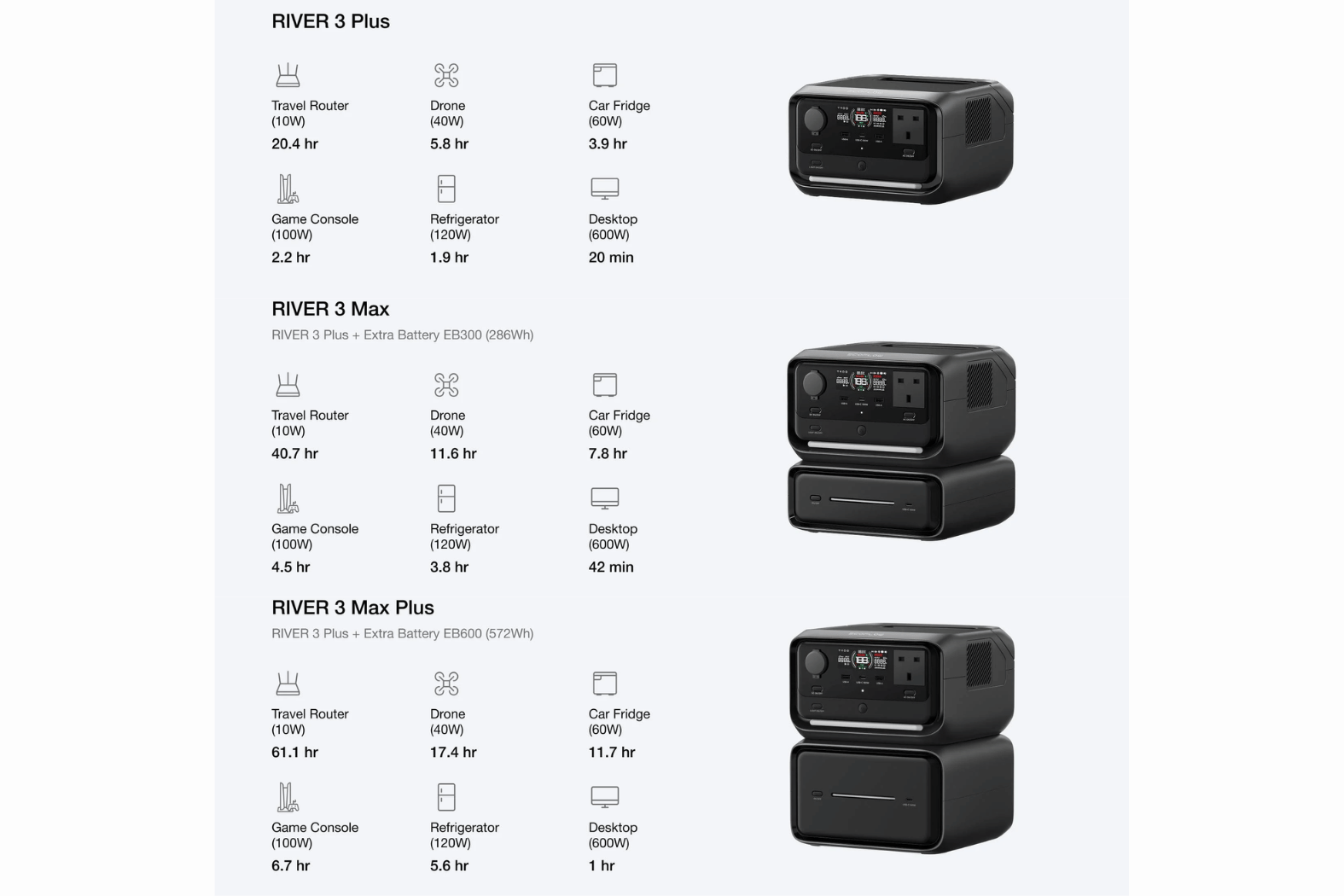 | Battery Size | River 3 plus, River 3 plus + Extra Battery 300, River 3 plus + Extra Battery 600 |