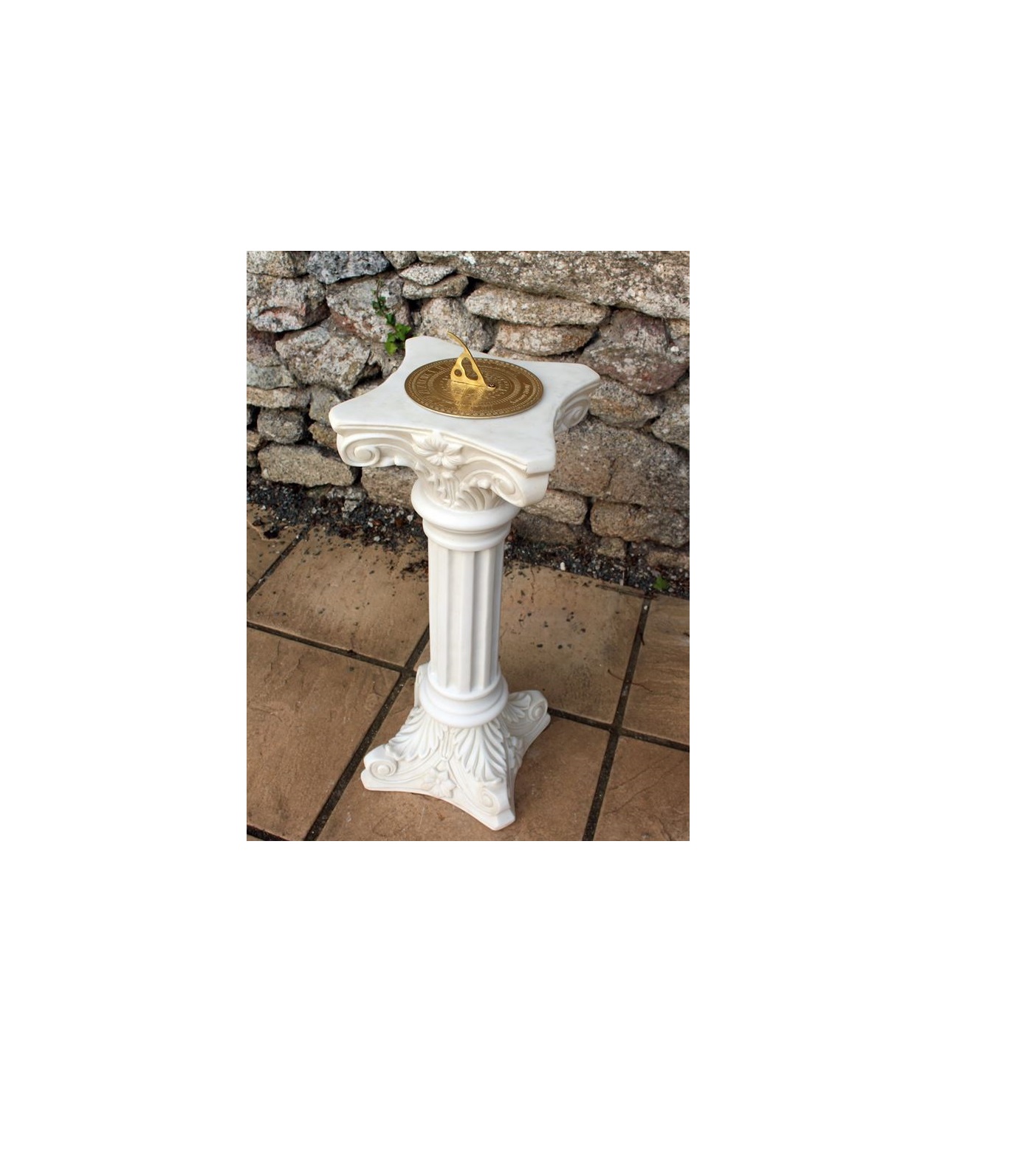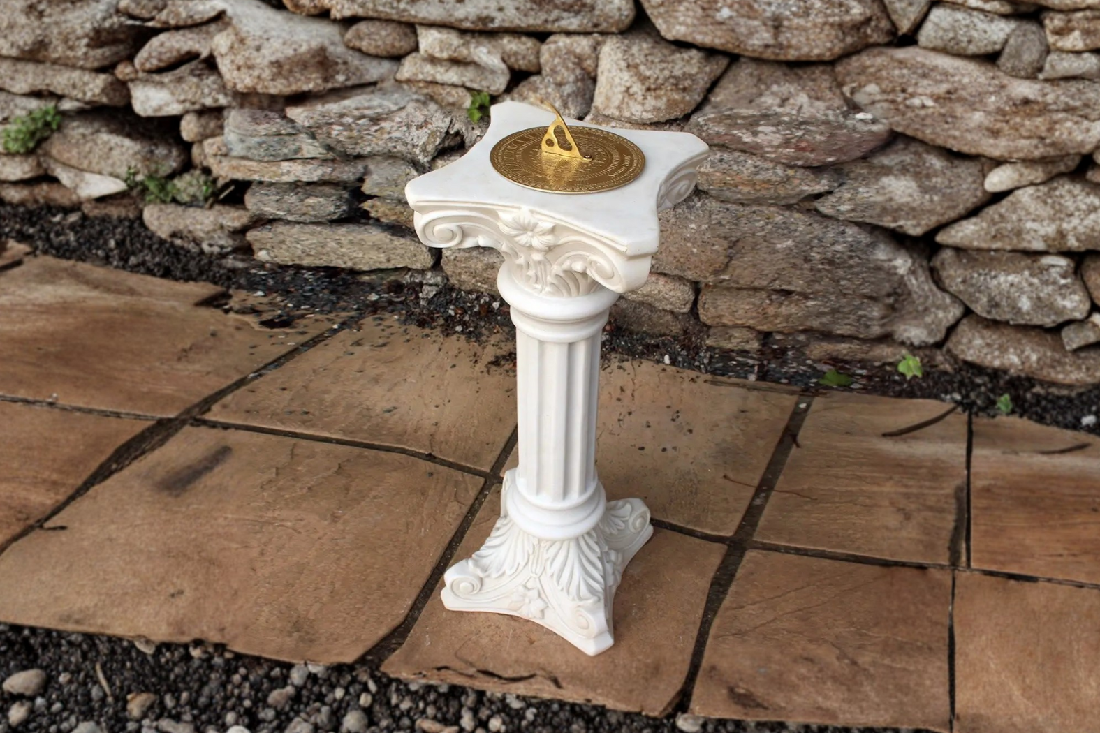 Crafted from crushed marble mixed with resin, this sundial achieves a smooth, alabaster-like finish that emulates a refined stone surface. Its central column is slender yet sturdy, decorated with traditional motifs referencing Victorian aesthetics. The brass dial and gnomon (the shadow-casting arm) feature Roman numerals, offering both ornamental value and a symbolic means of telling time.