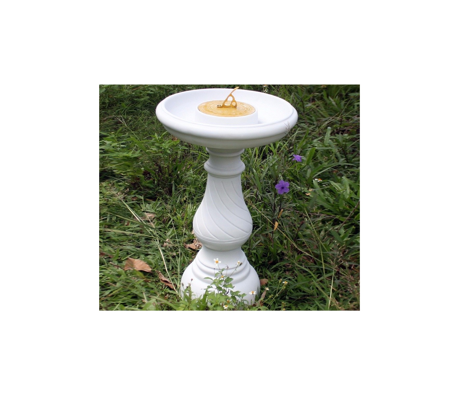 Standing at 70 cm tall with a 40 cm diameter, the sundial features a gracefully formed pedestal with a subtly etched swirl pattern. The smooth, alabaster-like finish enhances its classic appeal, while the metal sundial at the top catches sunlight, casting a moving shadow throughout the day. This combination of form and function ensures that the sundial is not only a decorative piece but also a practical timekeeping instrument.
