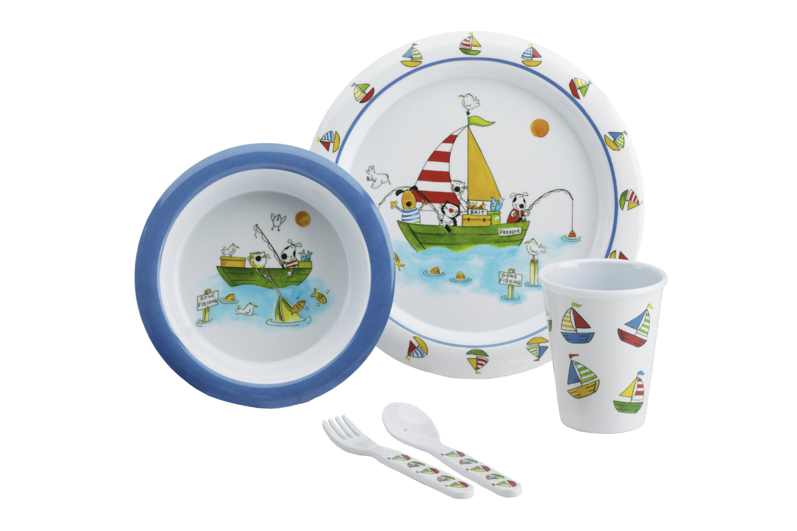 Set comprises of: 1x plate, 1x bowl, 1x beaker, 1x fork, 1x Spoon
