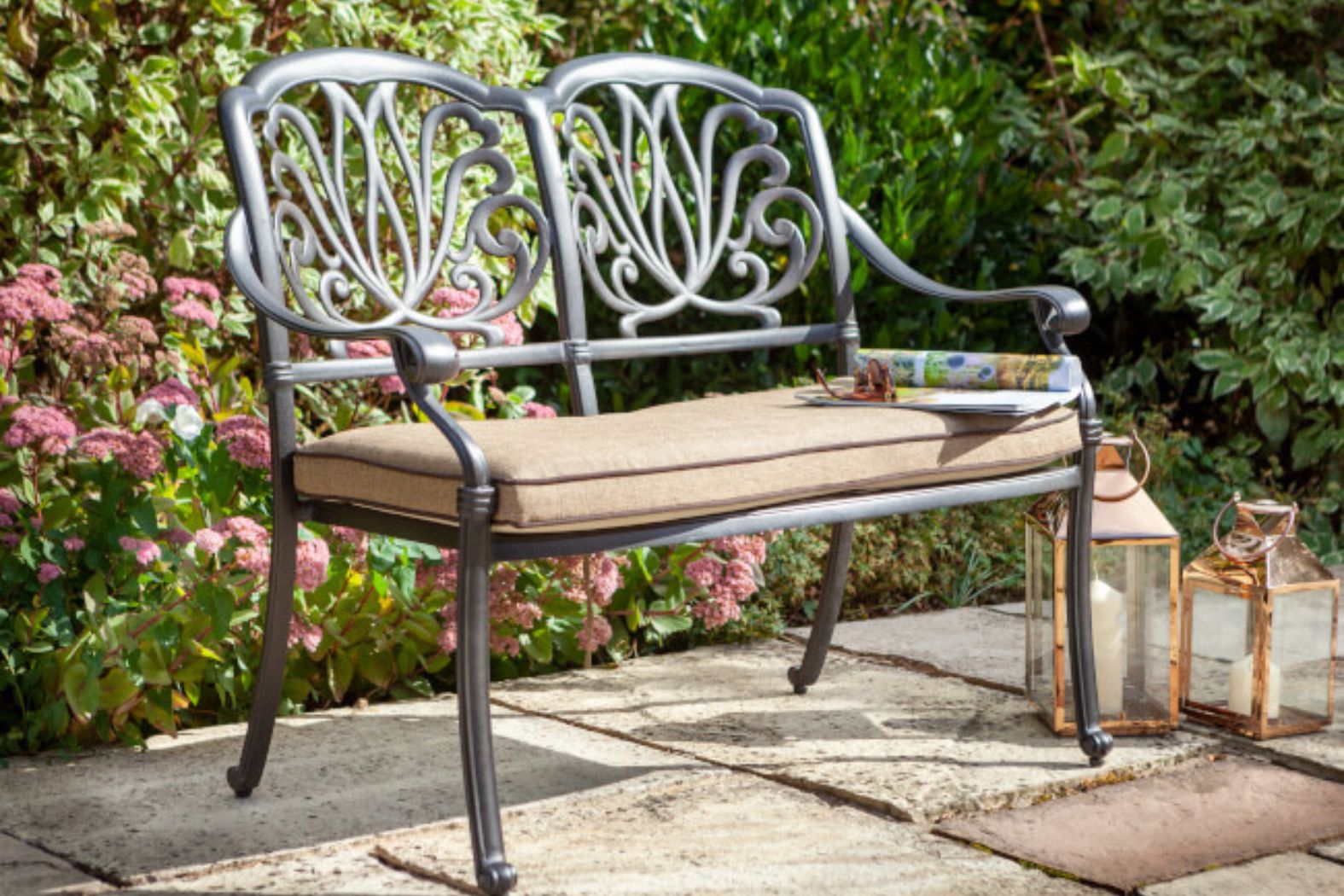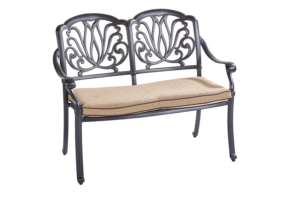 The Amalfi High-Back Bench Bronze/Amber lends itself to year-round outdoor use thanks to the weather-resistant frame and cushions. Regular care is minimal — simply clean the frame with warm soapy water and store cushions during harsh winter months. In addition, a protective cover will help maintain the finish and prolong the bench’s lifespan.