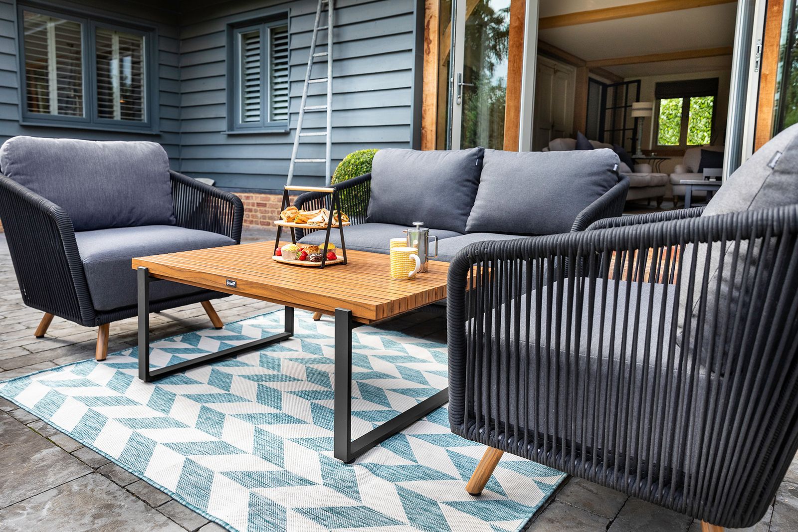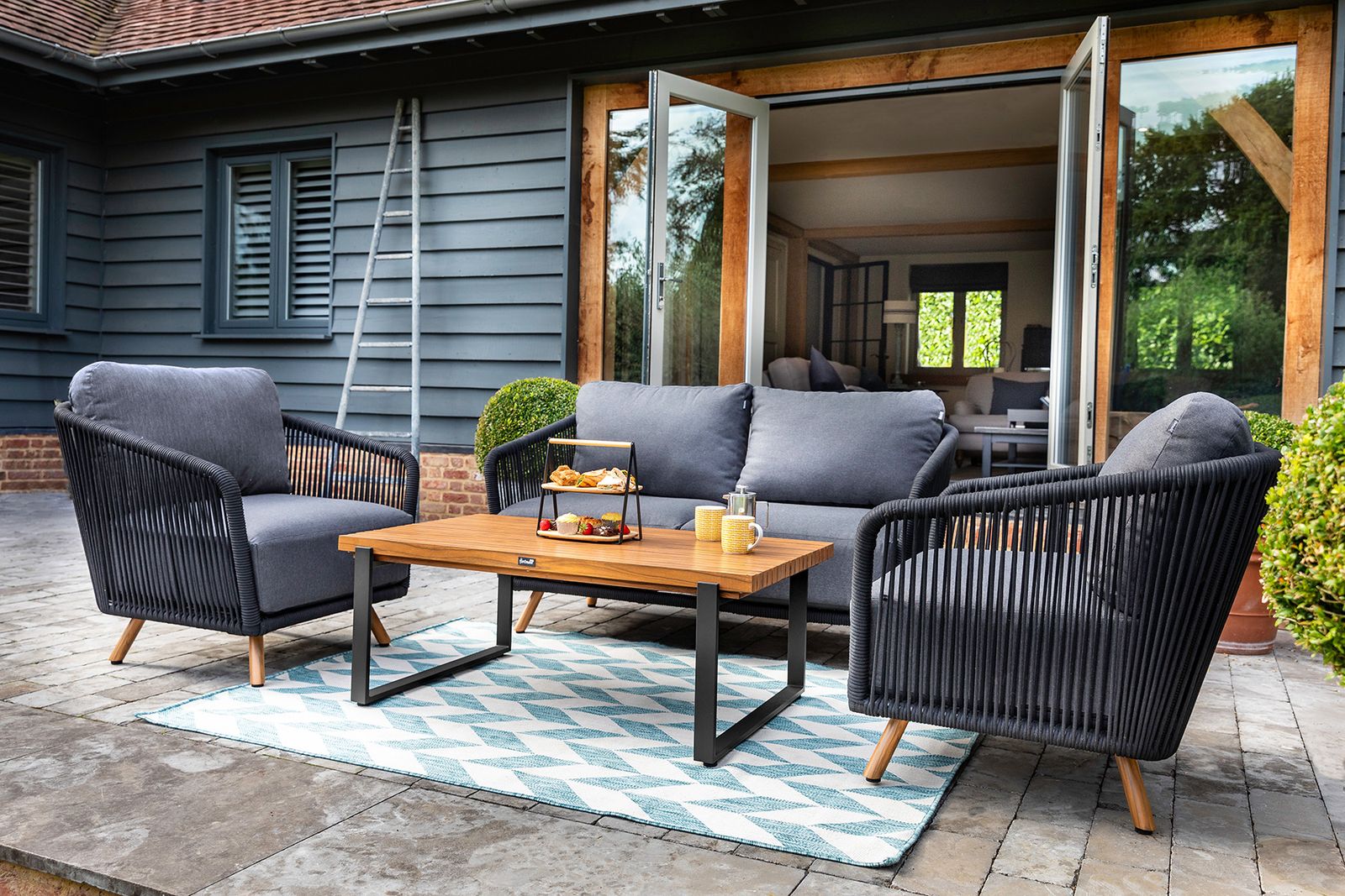 Crafted for the British climate, this set comprises strong, rust-resistant aluminium frames and weather-resistant rope. The cushions use Weatherready® technology, meaning they resist water, UV and mildew—so they’re built for outdoor life. The table top’s foiled aluminium (Folie) layer is heat and scratch-resistant, offering stylish looks with real practicality. Adjustable feet on table and seating ensure stability even on uneven surfaces.