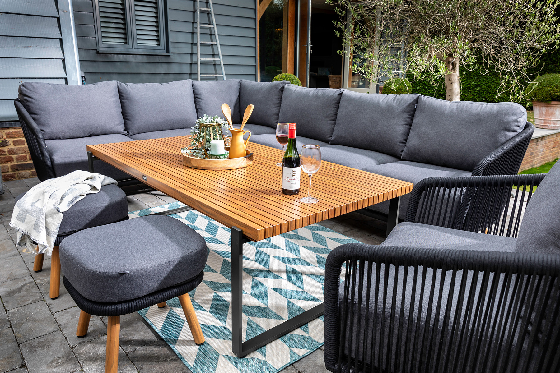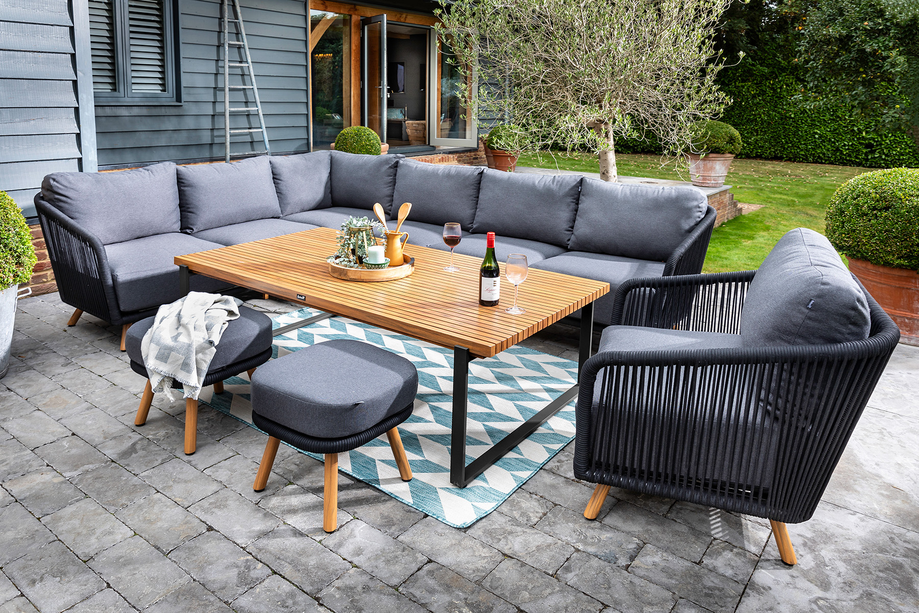 Ideal for entertaining, this set brings together a large rectangular table and versatile seating modules. It’s tailored to bring people together—whether that’s for dinner, drinks or just catching up outdoors. Moreover, the modular components allow you to arrange the sofas, chairs and stools to fit your garden layout and occasion. In addition, the stylish finish and option for year-round outdoor placement (with cushions stored or covered in colder months) make it a long-term investment in your outdoor lifestyle.