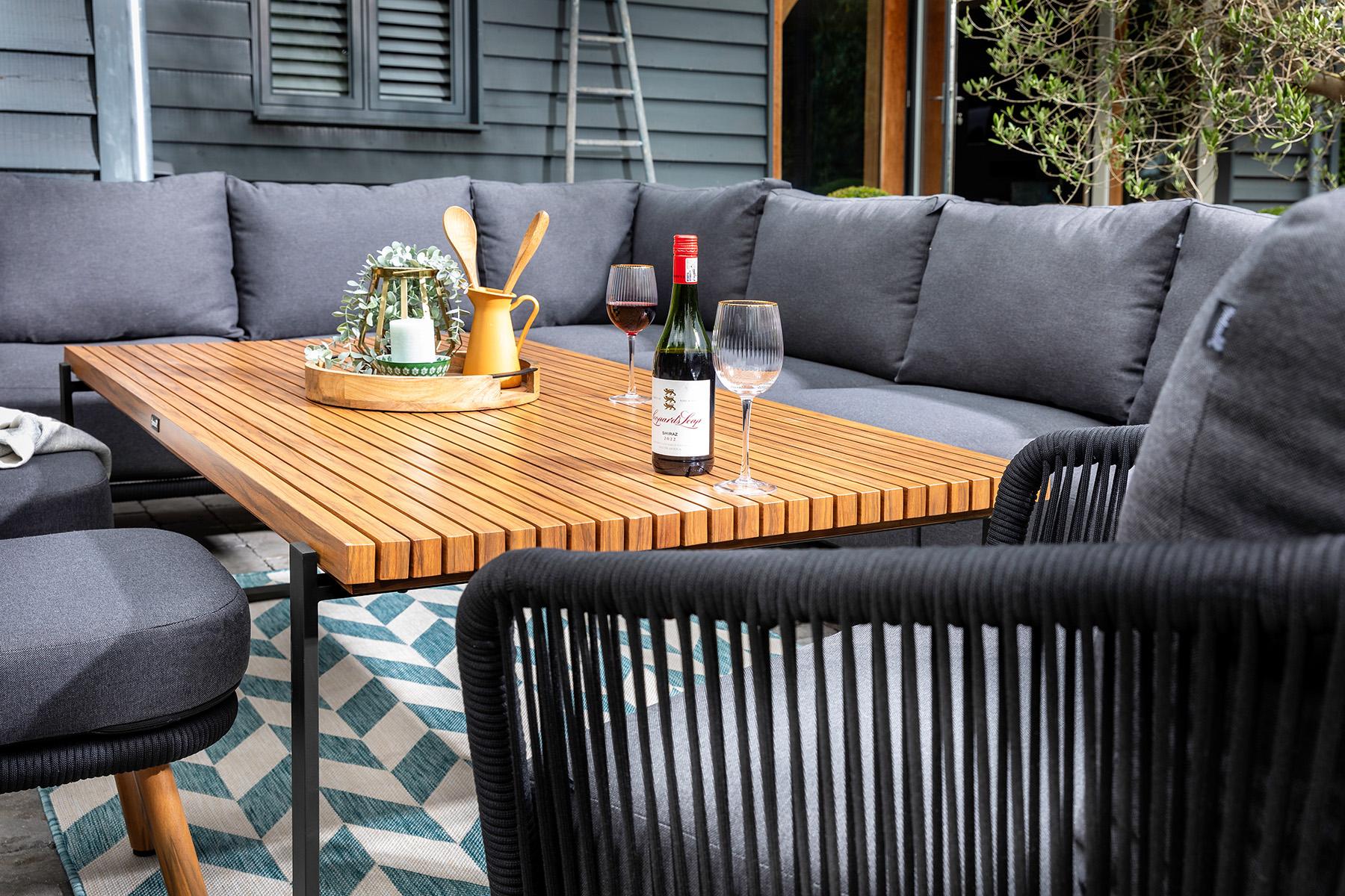 The Eden set features thick, deep-filled Weatherready® cushions wrapped in Black Noir fabric, giving you plush seating that’s designed to endure. Furthermore, the woven all-weather rope in Raven black adds texture and elegance that complements the Carbon frame for a striking aesthetic. In addition, the Folie (wood-look) foiled aluminium tabletop mimics natural timber but requires none of the maintenance. Moreover, the generous seating arrangement ensures guests can relax and linger comfortably long after the main course.