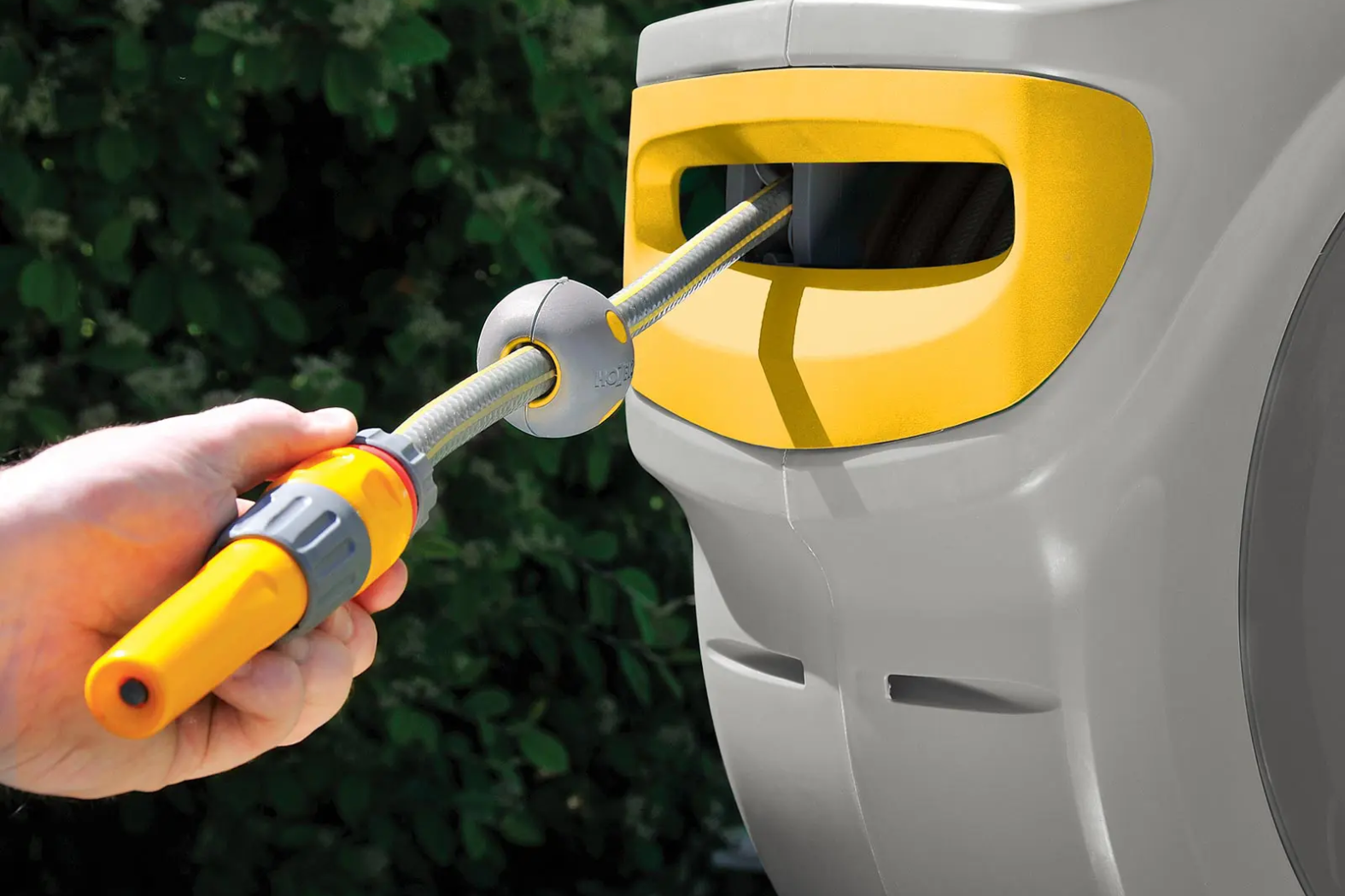 Because the hose stays inside the reel, it stays out of direct sunlight and doesn’t tangle or kink. Moreover, you get a tidy appearance and less wear. The spring-loaded mechanism retracts the hose smoothly, so you don’t have to drag the entire length after use. In addition, the built-in ratchet system allows you to pull out the hose to the desired length and lock it in place.
