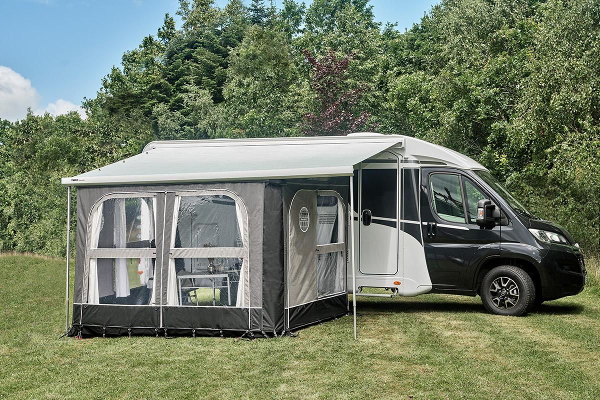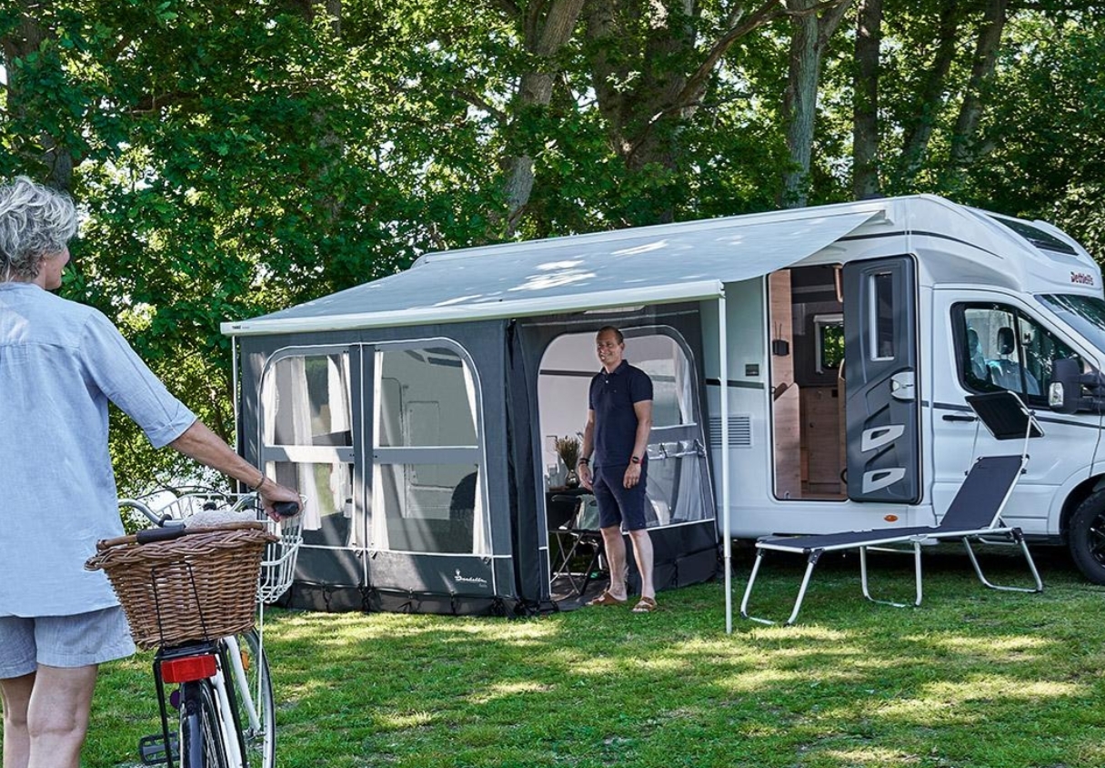 The front simply zips on, while strong magnets hold the awning roof and side panels together. You can place Buddy wherever you like on the awning, giving you the unique options to create both an enclosed living space and a covered porch under the motorhome’s awning.
