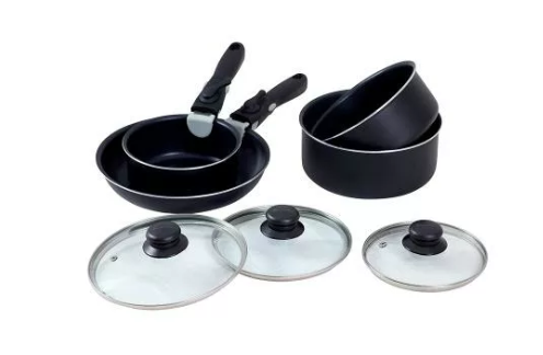 The set consists of three pots, one frying pan, three lids and two removable handles and can be used on ceramic, gas or induction hobs.