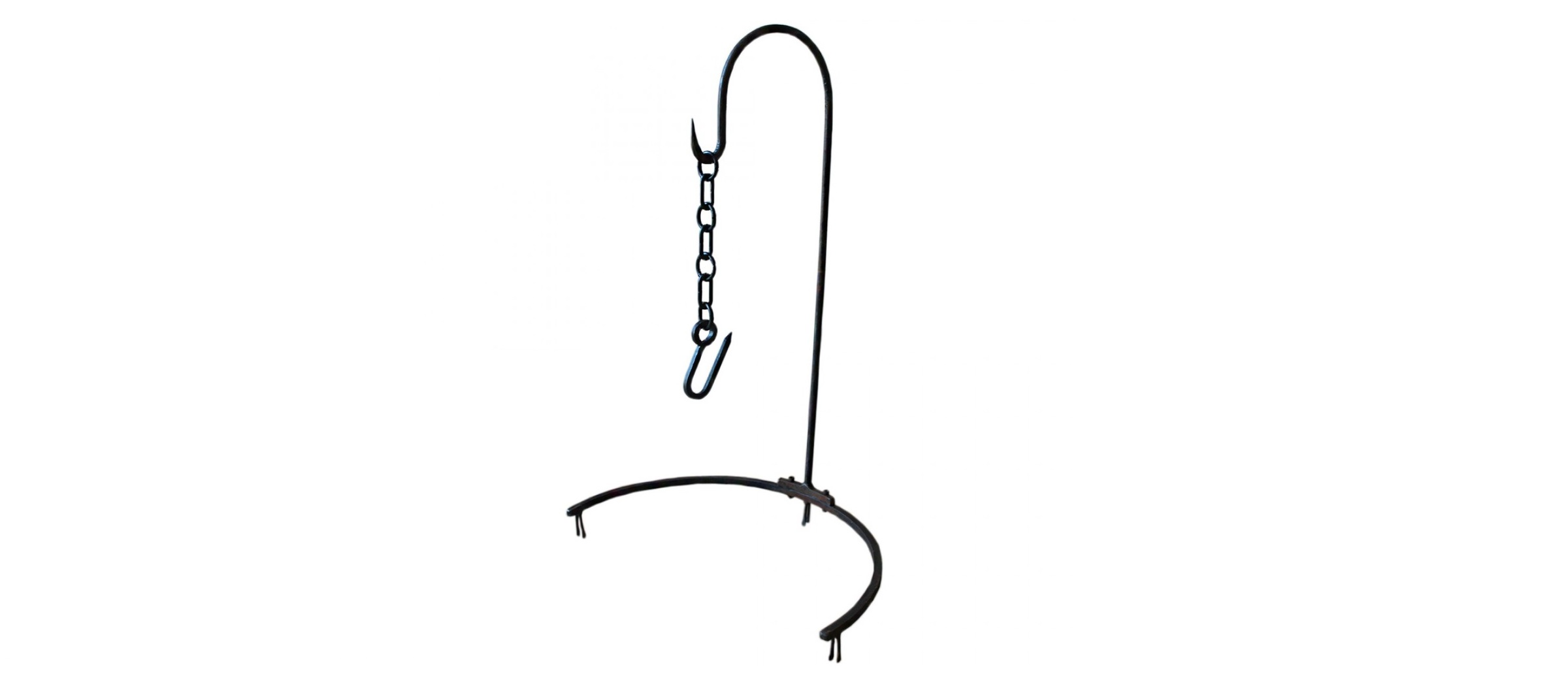 The Travel Kadai Hook sits on the edge of your Travel Kadai and comes with a chain to be used with the Travel Kettle and Skillet. Comes apart to fit into the Travel duffle bag.