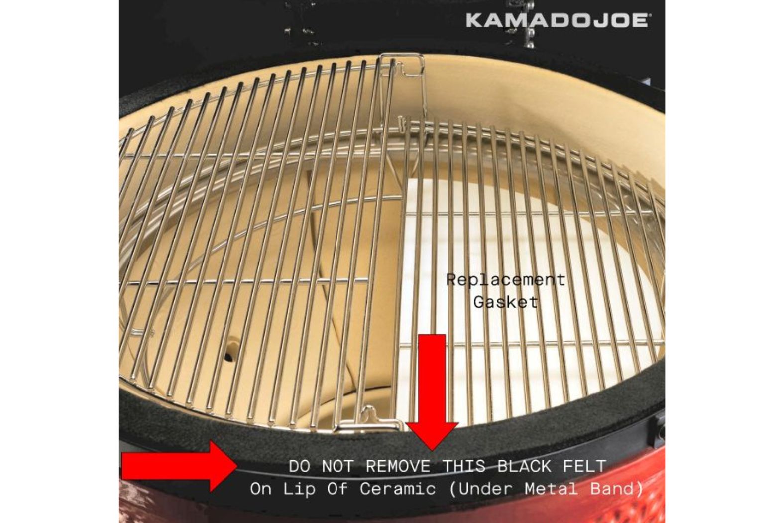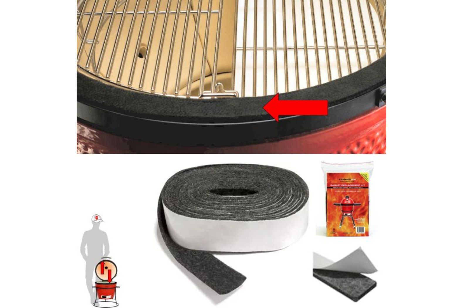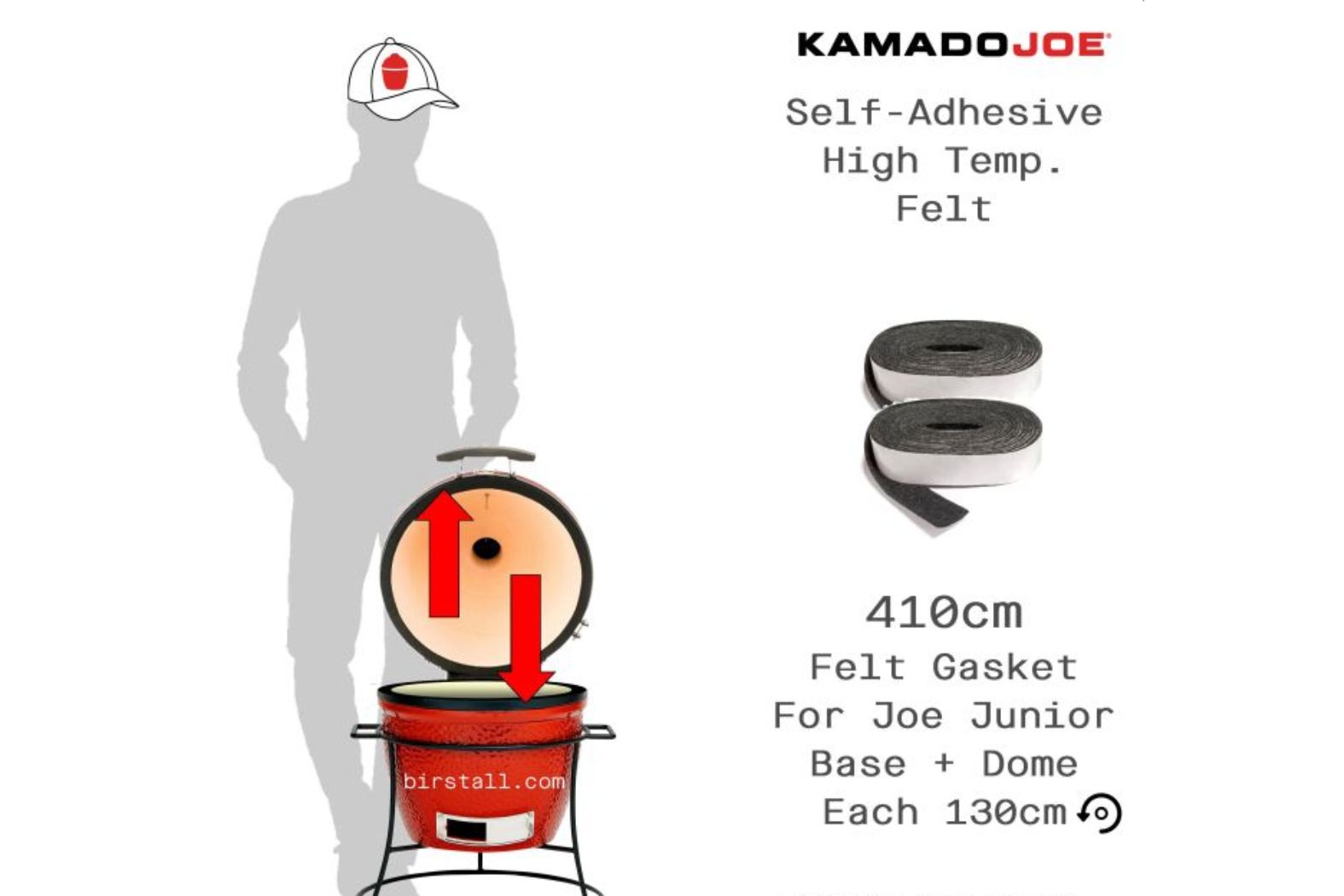 Replacement felt gasket kit to fit Joe Junior, Classic I, II & II Kamado Joe models. Self-adhesive for easy replacment of old worn out greasy gaskets. Kit is supplied as ONE Long 410cm length with enough for the lower base and top dome lid, simply cut to length