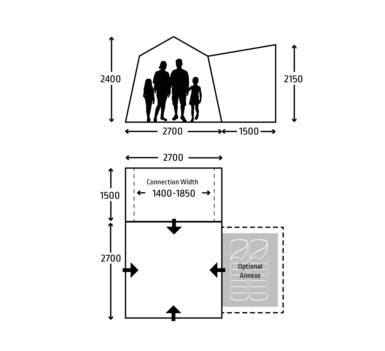 With a 2.7 m width and connection height from 180 to 210 cm, the Kampa Cross Air Tailgater Drive-Away Awning adapts to a variety of campervan sizes. The front canopy adds outdoor shade and shelter, and the clear canopy profile ensures decent light in the living area. Furthermore, the included canopy pole, pegging kit and carry bag make the system complete and ready for the road.