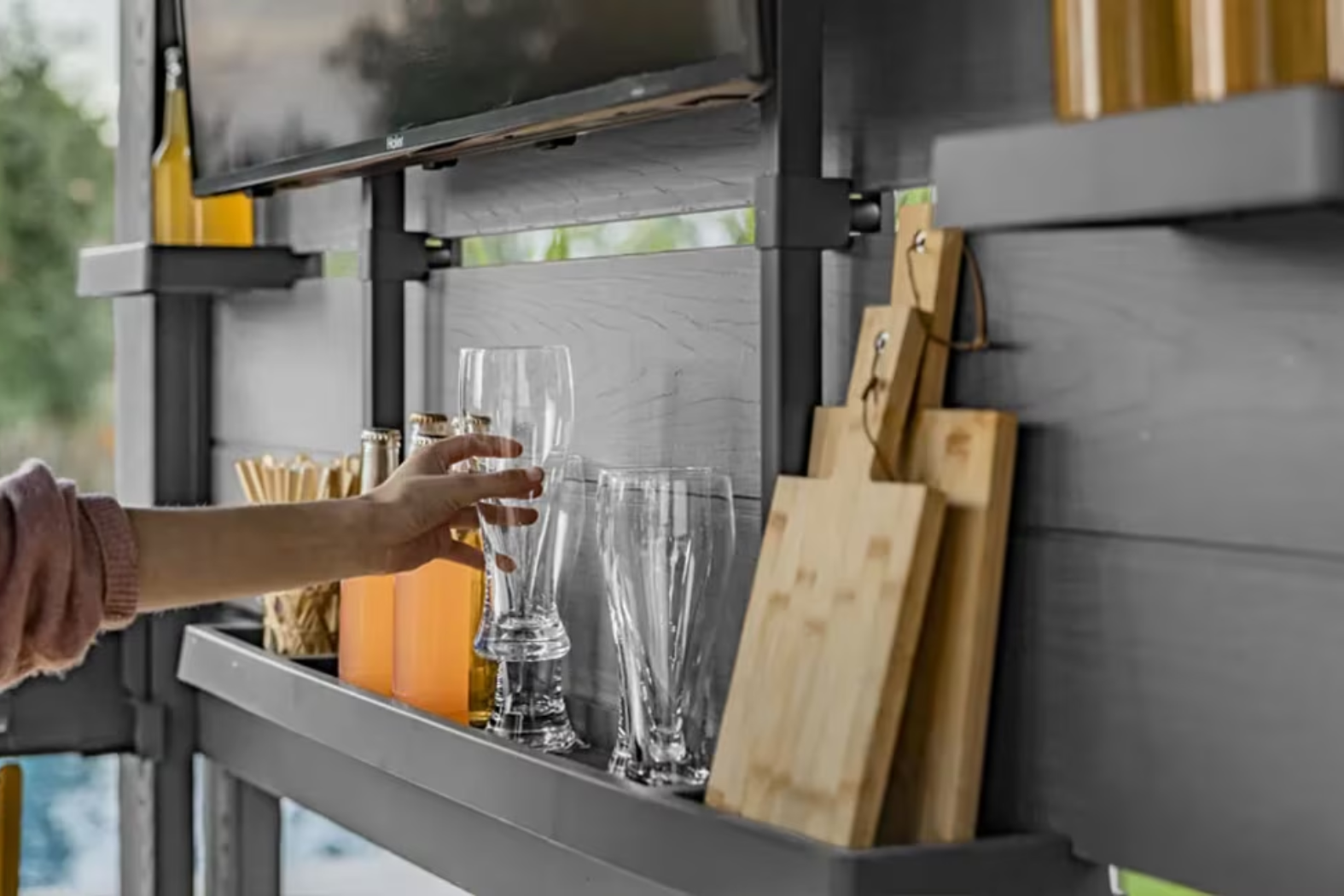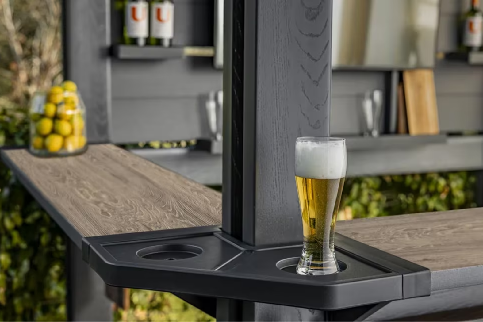 With its modern wood-look finish and smart built-in features, it creates a dedicated space for preparing drinks, serving food, and enjoying time with friends and family. Moreover, the compact footprint makes it easy to position in a variety of garden layouts. As a result, it becomes a true focal point without overwhelming your space.