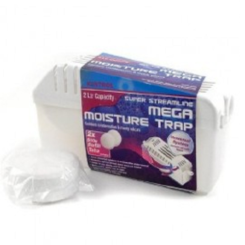 Kontrol Mega Moisture Trap 2L A Kontrol Super Streamline MEGA Moisture Traphelps reduce the relative humidity in damp rooms to an acceptable level. This helps prevent all the undesirable consequences of high humidity, such as condensation, a musty smell, mould, damp patches, vermin and wood rot. The Kontrol Super Streamline MEGA Moisture Absorber Trap works on the basis of salt tabz which absorb moisture. The system is noiseless and requires no electricity or batteries. Refill Tabz are available. The Kontrol Super Streamline MEGA Moisture Absorber is ideal for use in a caravan, boat, shed, cellar, or any of the rooms in a house. Features include locakble lid, easy pour spout and large 2 litre capacity. Depending on the relative humidity, this Super Streamline MEGA Moisture Absorber with 1kg Refill is effective for 2 to 3 months in a room of 30 cubic metres. – Super mega moisture trap,2 litres.size H17cm x W34cm x D11cm – Combats musty odours and condensation. – Battery free,works day and night,simple to use,sturdy,neat and clean. – Refill replacement indicator/ideal caravans,boats,wardrobes,kitchens – Tabz last 2-3 months depending on humidity