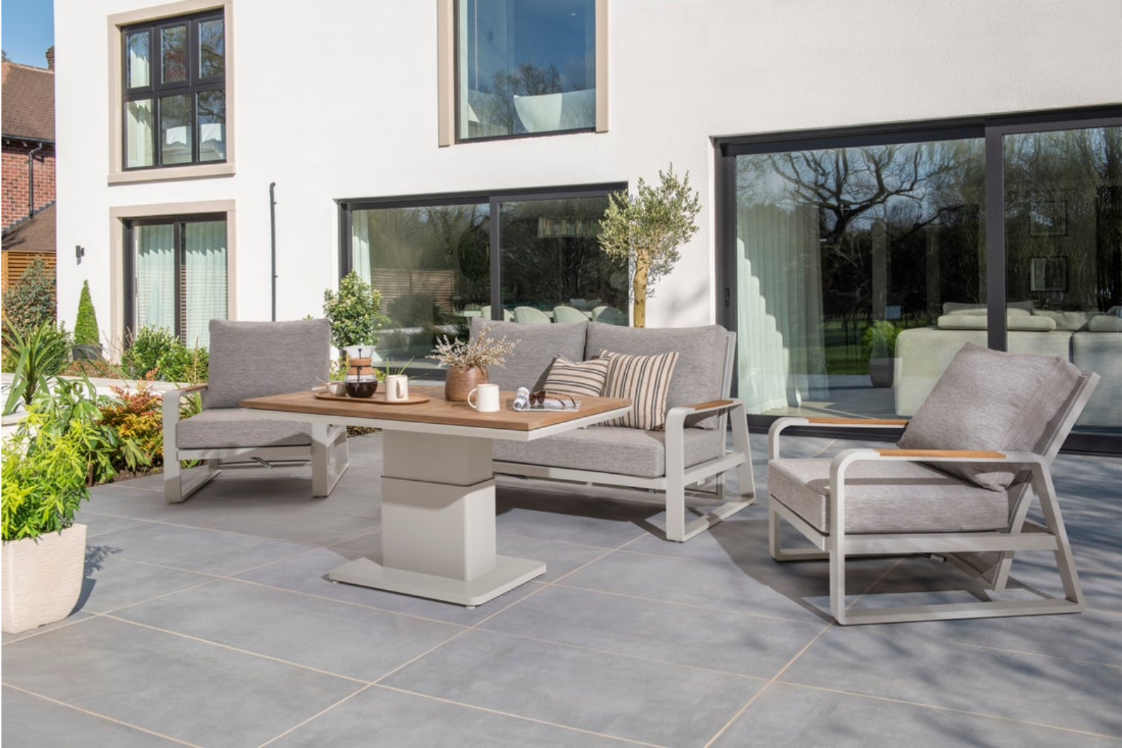 The Life Montana 2.5 Seat Sofa Set in Beige offers a seamless blend of chic design and functional flexibility for your outdoor space. With its thoughtful combination of a generous sofa and matching armchair, plus a sleek height-adjustable table, this set adapts from casual lounging to sophisticated al-fresco dining with ease. Furthermore, the Soltex-beige cushions paired with a powder-coated aluminium frame in warm tones deliver a fresh, modern aesthetic suited to patios, terraces or gardens.