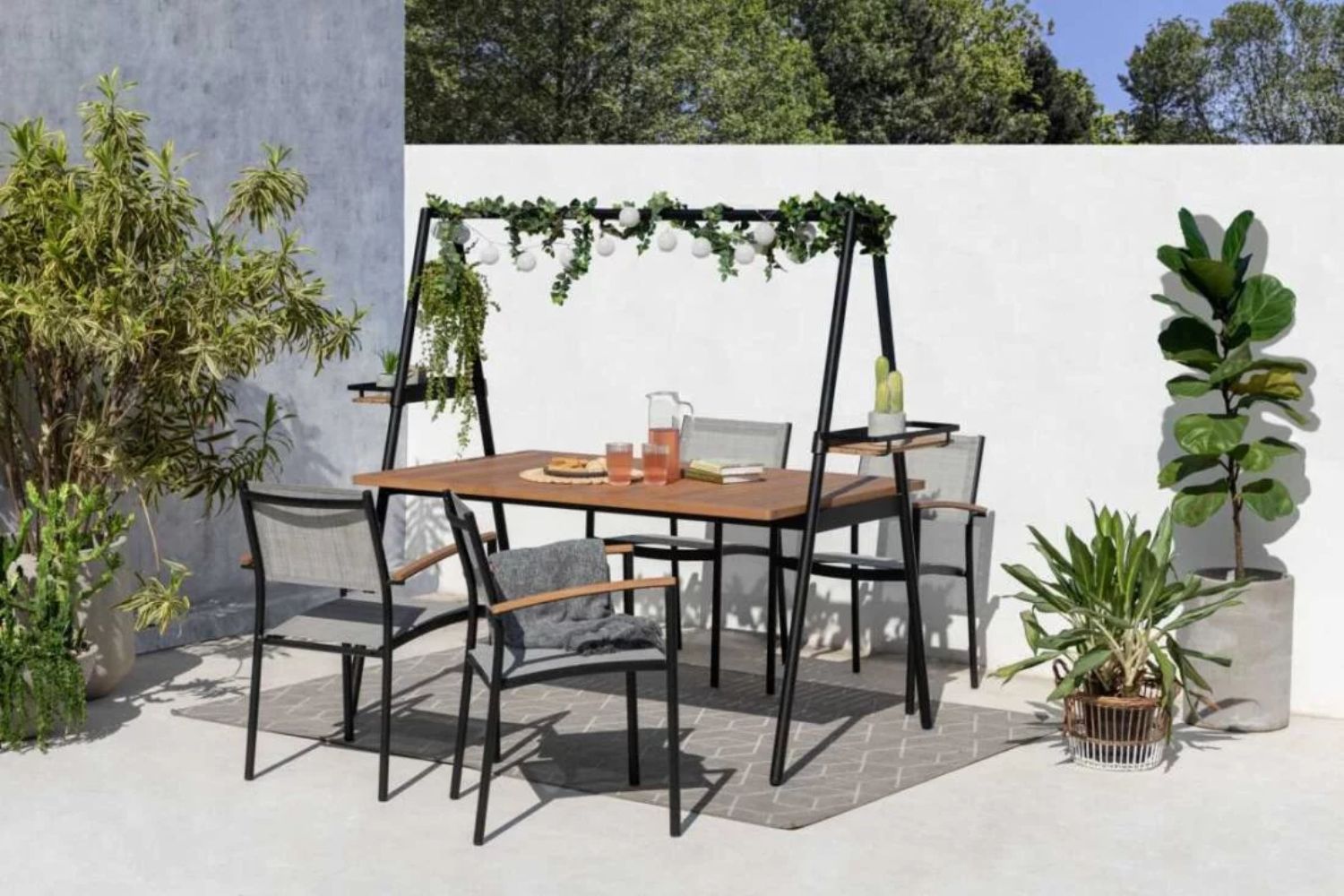 The set features a unique Tipi-style table frame with tall triangular ends. This adds architectural interest and gives your garden a bold, modern feel. At the same time, the design remains practical. The overhead bar and side shelves provide extra space for drinks, decorations, or small plants — great for parties or casual dinners. Because of this, the set becomes more than just furniture — it becomes a conversation piece.