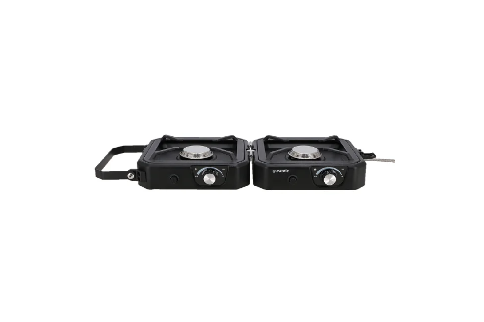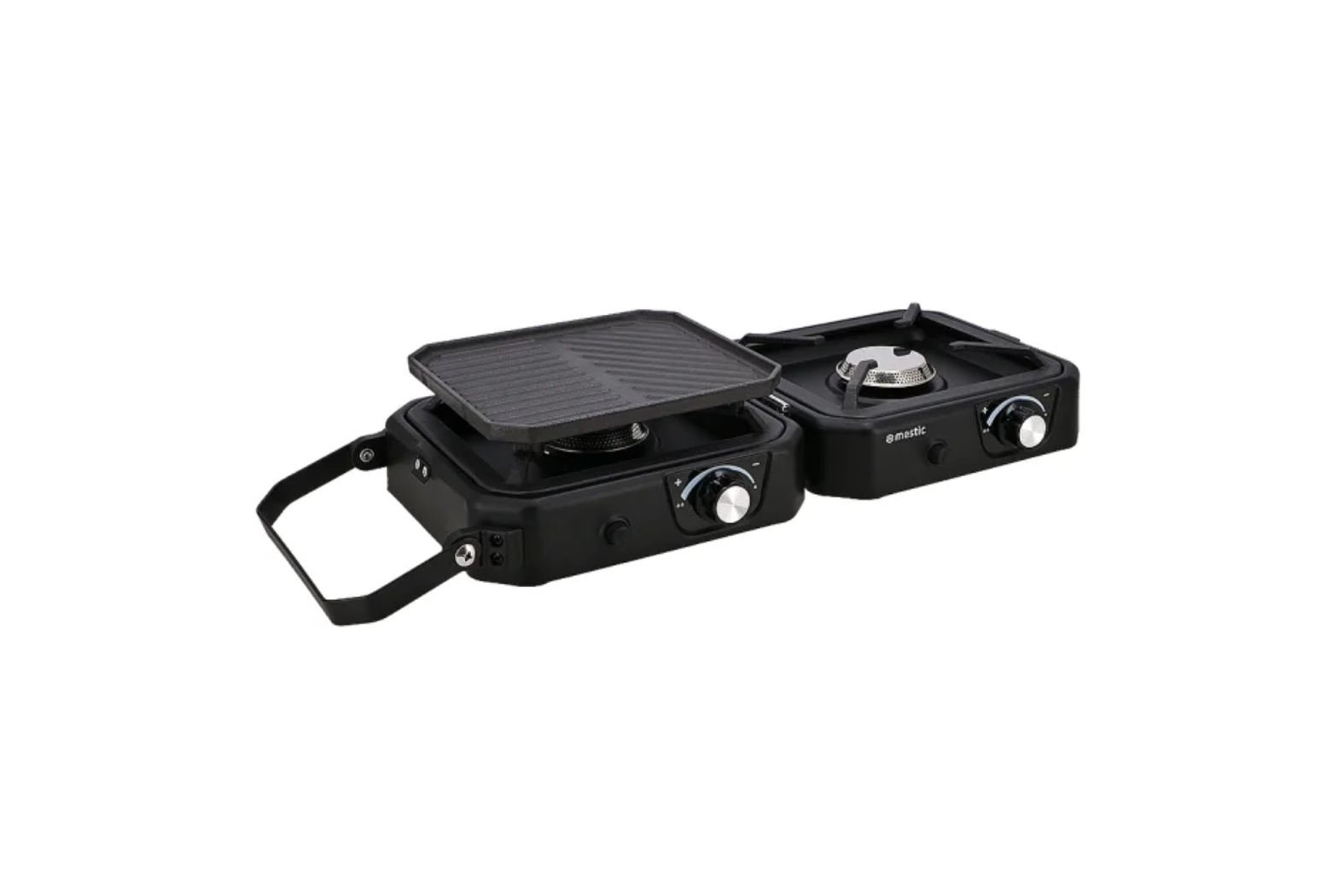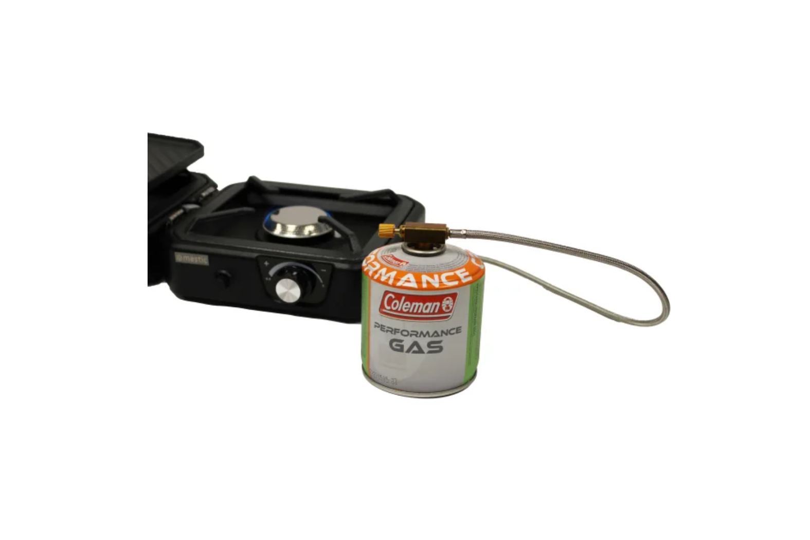 Compact and foldable 2 burner camping stove, complete with griddle plate and carry bag. For use with screw threaded gas cartridges such as the Coleman 300 – A0016143 and 500 – A0016144