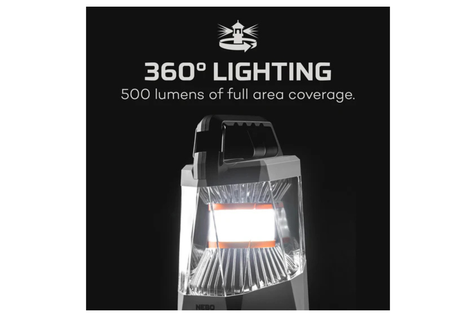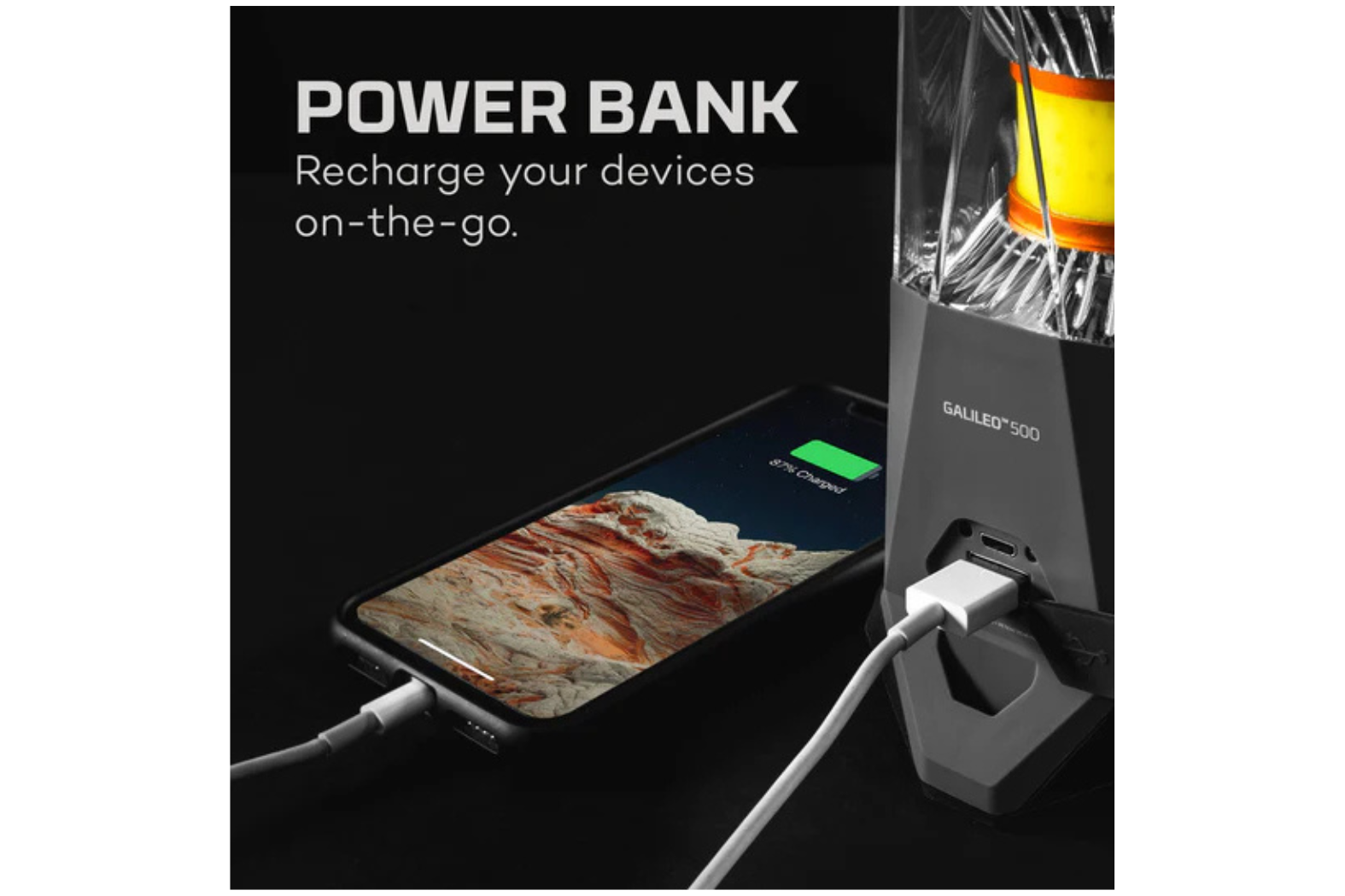 The Galileo 500 lantern by NEBO is a rechargeable, 500 lumen lantern with multiple beam patterns, dimming, direct-to-red, Smart Power Control, and carabiner-style carry handle. Featuring a USB output connector for powering 2600mAh charging of most USB devices and a carabiner-style handle.