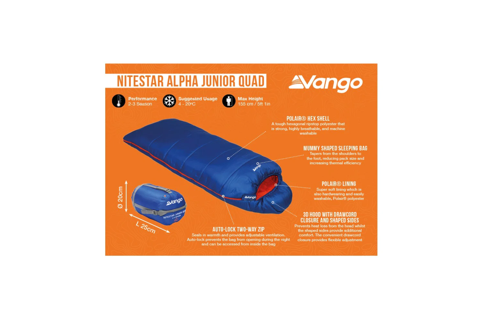 - Auto-Lock Two-Way Zip – Seals in warmth and provides adjustable ventilation. Auto-lock prevents the bag from opening during the night and can be accessed from inside the bag