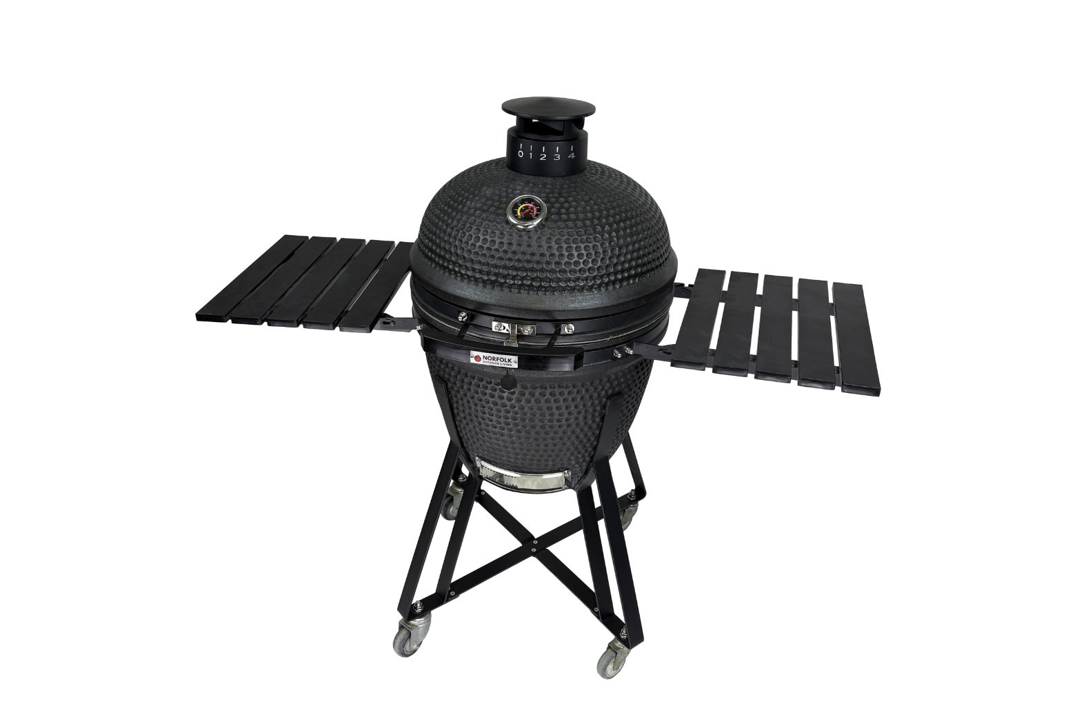 The Core Kamado Ceramic Grill is designed by Norfolk Outdoor Living for those who want the full kamado experience in a more compact and manageable size. With its 21-inch cooking space, it gives you plenty of room for family meals while still fitting comfortably into smaller outdoor spaces.