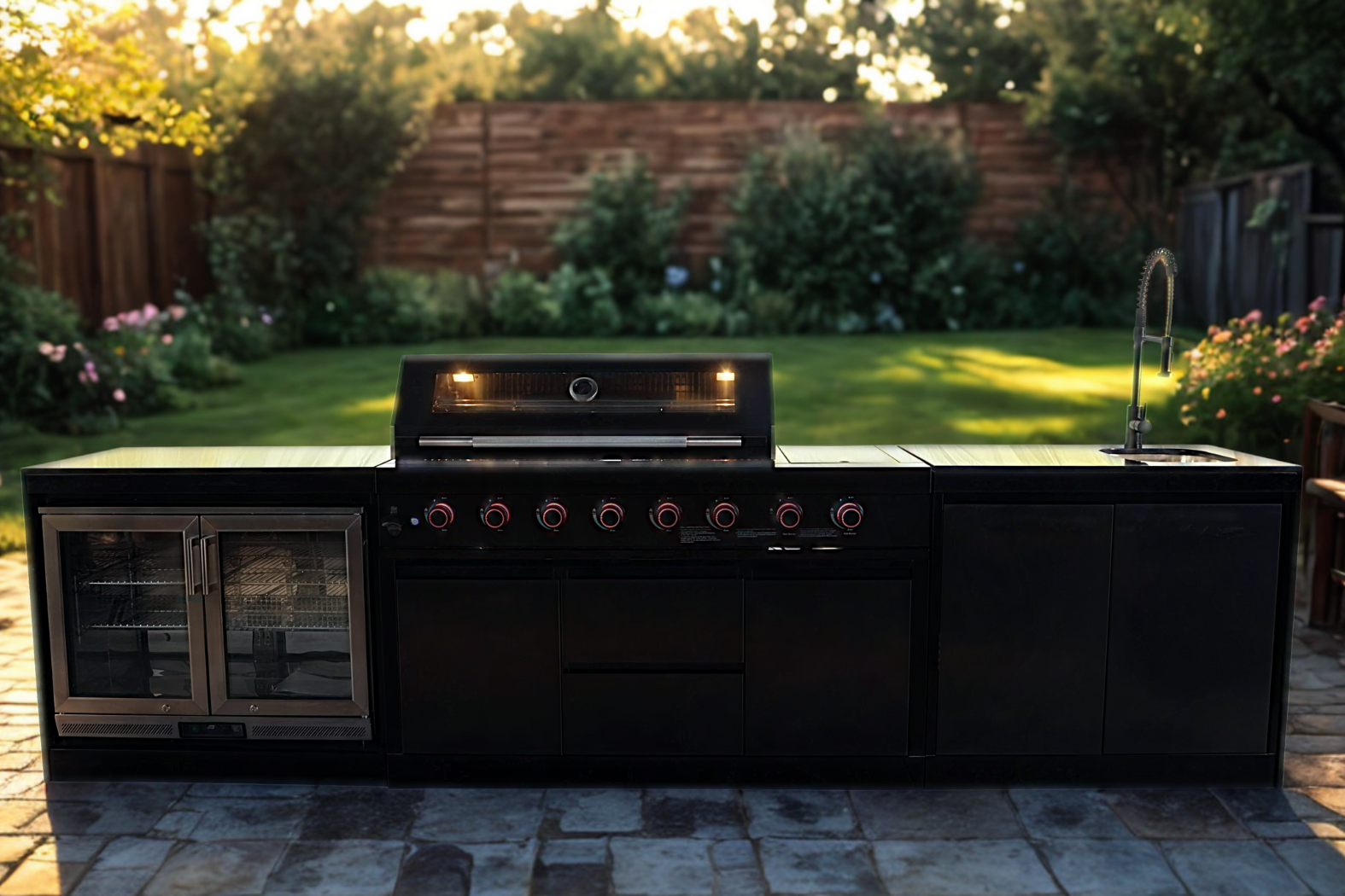 This modular unit brings together every key component you need for gourmet outdoor cooking. Its layout includes a high-performance 8-burner gas grill, a side burner, an integrated sink with tap, and a dual-door fridge. In addition, the granite worktops provide generous prep space and a refined aesthetic. The built-in elements blend seamlessly for both form and function.