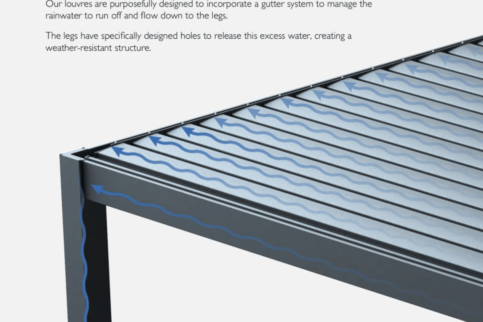 Thanks to the tilting double-layer louvres, you can adapt the pergola to changing conditions: open them to let sunlight flood through or close them to create a fully waterproof roof. Moreover, the clever drainage channels built into the frame capture rainwater and channel it discreetly through the hollow legs — so you’ll rarely see any drip beneath the roof. In addition, the durable aluminium frame is rigorously engineered to withstand wind loads and the varied British climate.