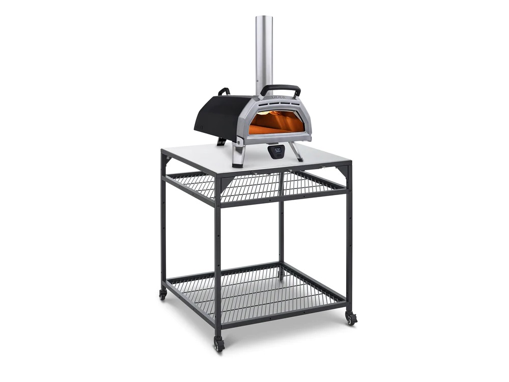 This table is made of robust powder-coated carbon steel. They also feature two height-adjustable shelves and built-in hooks for your Ooni peels and accessories. Plus, the two lockable castors will keep your table steady while you cook.