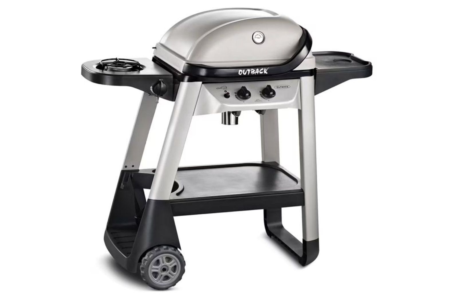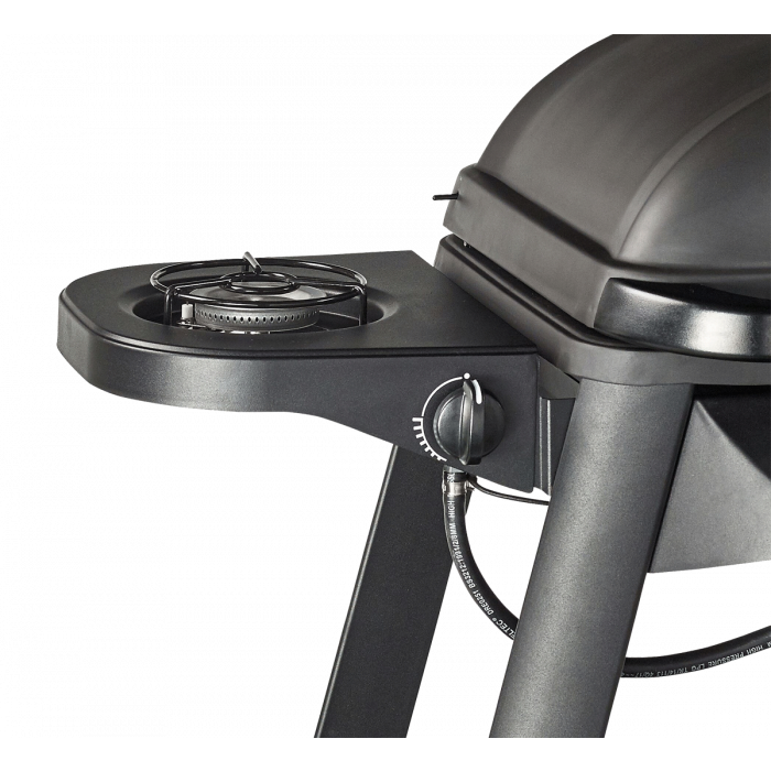One of the two side tables includes a side burner the left of the main cookbox for the cooking of sauces and accompanying foods which are not suitable for cooking on the main cooking surface in the cookbox. The other side table is perfect for food preparation and has utensil hooks to keep necessary tools close at hand. Additional items can be stored underneath the barbecue on a shelf.