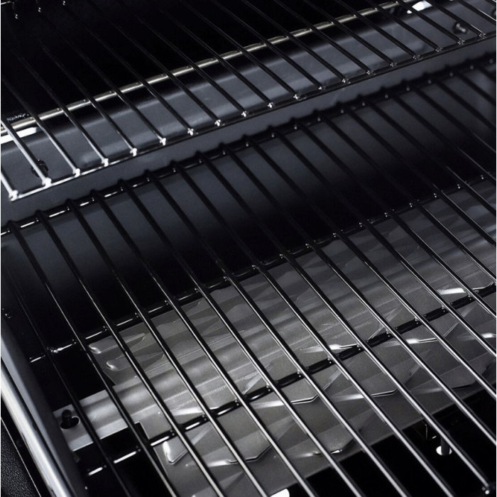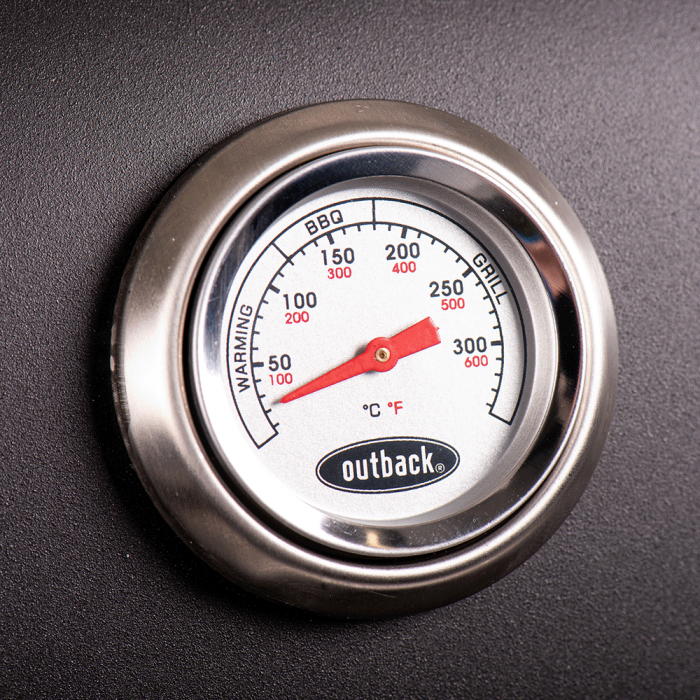The warming rack attached to the lid of the Outback Excel Onyx 311 Burner Gas BBQ now has an integrated temperature gauge to help watch, regulate, and maintain cooking temperatures.