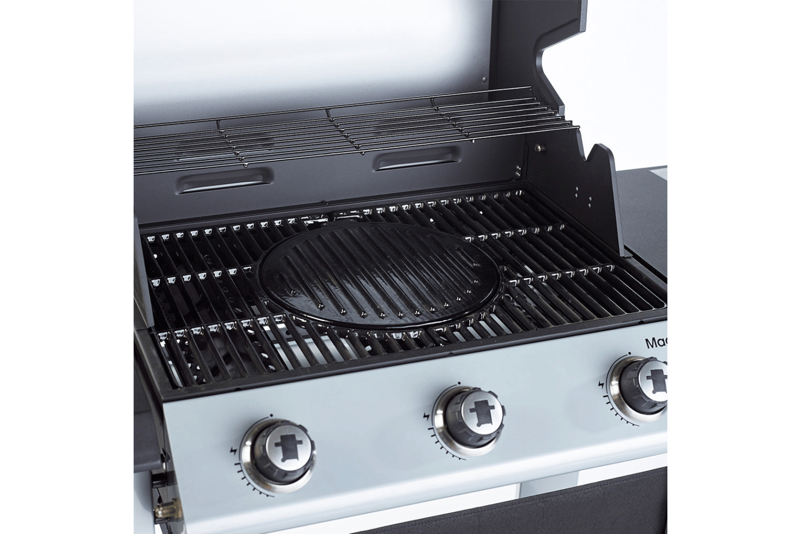 The Outback Magnum 3 Burner Hybrid BBQ features three stainless-steel burners and a dedicated charcoal compartment, giving you true hybrid flexibility. Furthermore, the interchangeable cooking surface lets you swap in a pizza stone, griddle, wok or steak grate for maximum versatility. In addition, the included charcoal basket allows the use of Outback Coconut Shell Briquettes for authentic charcoal flavour with simpler ignition.