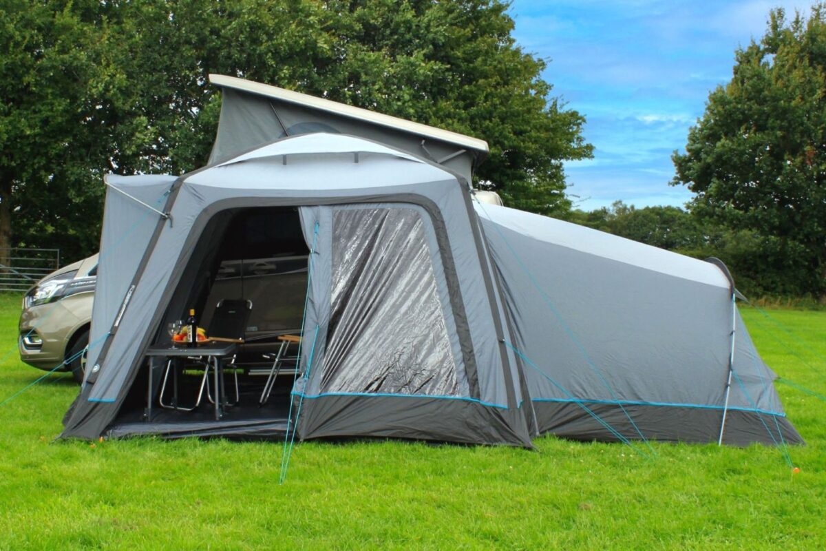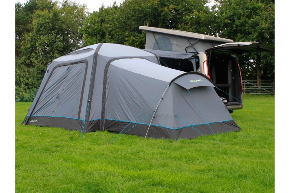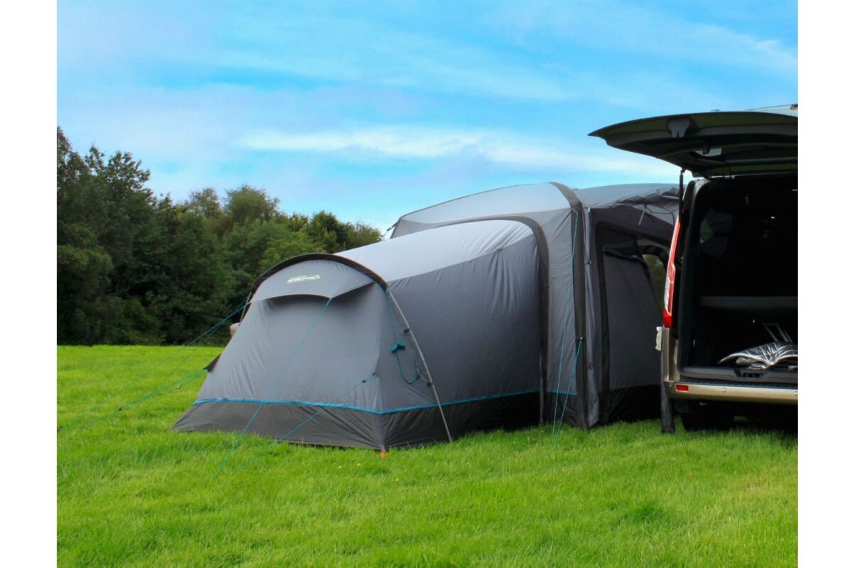 The Cayman Annexe (2025), which comes with a darkened “Twilight” micro-polyester 2-berth sleeping pod, easily zips onto the back of both models to provide a tall sleeping extension. This annexe, which is pitched simply using a single sturdy yet lightweight fiberglass pole, can accommodate up to three kids, two adults, or a double air bed. If you would like, you can use the annexe as extra storage or living space by removing the inner tent, which has an internal sewn-in groundsheet.