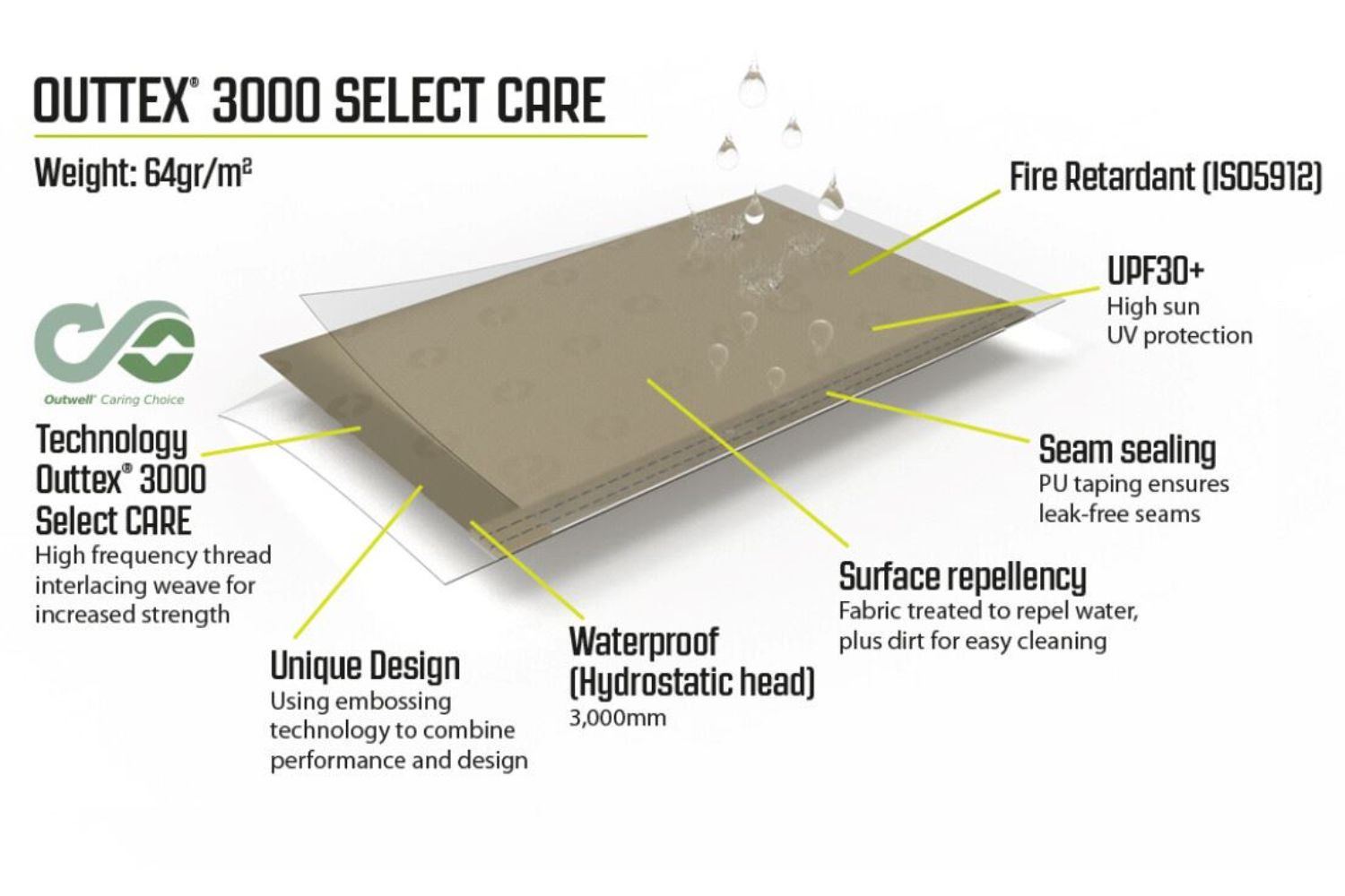 Outtex 3000 Select is a hard wearing, Quality, 100% polyester, Fire retardant and has a 3000mm hydrostatic head.